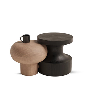 Part of Essentia Home’s luxury handmade furniture India collection, KOKESHI stands out for its expressive shapes, hand-aged finish details, and precision construction. Table A features a soft, bulbous silhouette reminiscent of a sculpted mushroom in a light natural veneer, while Table B offers a tighter, hourglass profile in a deeper tone—allowing both pieces to be styled as anchors or accents in luxury living rooms, galleries, and modern lounge environments.