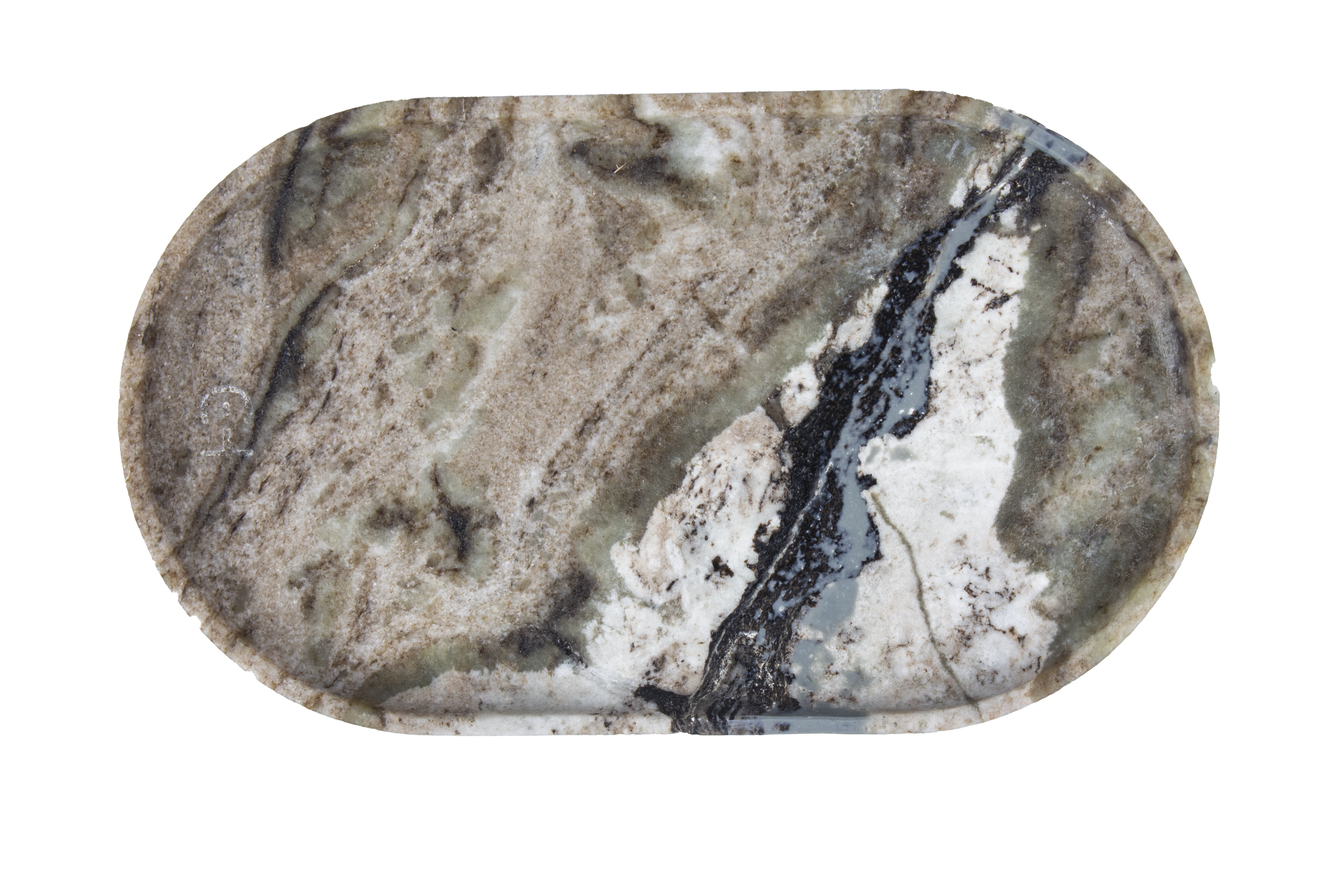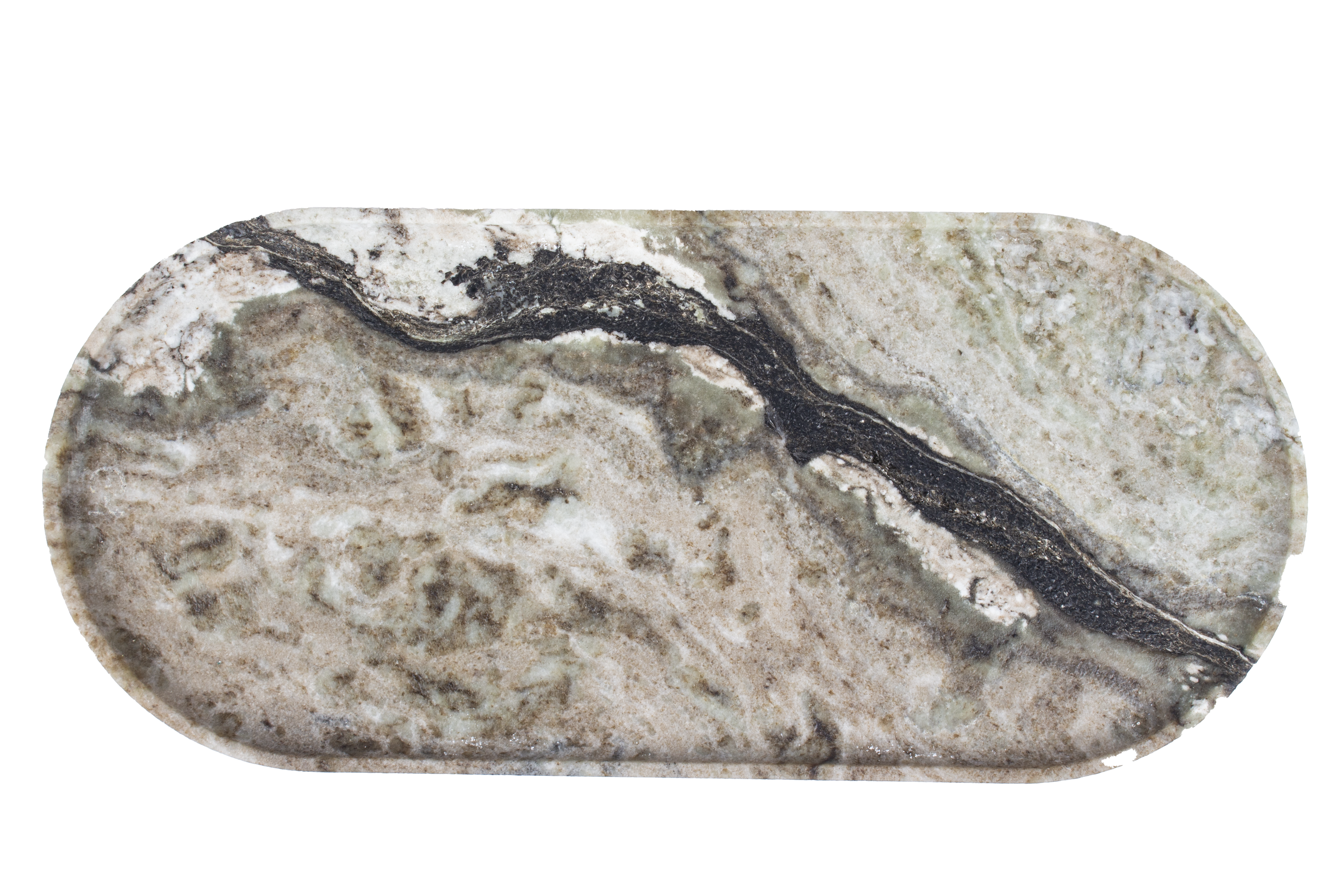 The oval shape contradicts the hard sharpness of the stone, which, when supported on a natural-but-treated surface, holds some beauty itself. This dichotomy of rustic and elegant makes this a sculptural serving tray, decorative slab set, or centerpiece in any curated space.