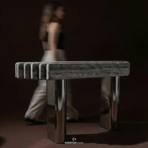 What contributes to this console its distinct presence is the way texture and structure work together. The upper form carries a tactile quality with visible material character, while the polished supports keep the design visually lifted. This balance prevents the piece from feeling overly heavy, even with its strong linear shape. Styled with objects or left largely open, it has the ability to frame the surrounding space rather than compete with it. It reads as functional, but also as a statement built through detail, contrast, and proportion.
