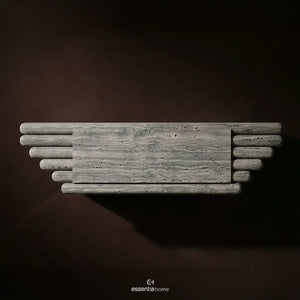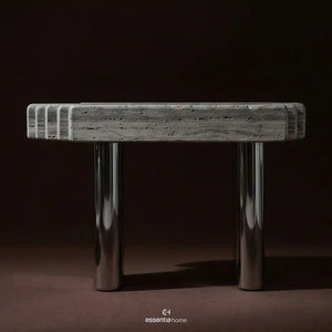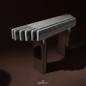 The Line Up Console stands out through repetition, rhythm, and material contrast. Its elongated top features a carved layered effect that gives the piece movement across its length, while the cylindrical metal legs bring a smooth reflective counterpoint below. The overall composition feels deliberate and graphic, making it ideal for entryways, corridors, or transitional spaces where furniture often needs to do more than simply fill a wall.