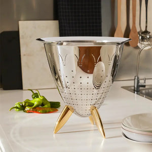Made from 18/10 stainless steel, its exterior gleams with a mirror-polished finish, while the interior contrasts in a subtle satin matte. The perforated dome-like bowl rests elegantly on three cast brass feet, lending the piece a sense of levitation and theatrical poise. More than just a kitchen tool, it’s a centerpiece that transforms straining into a statement.