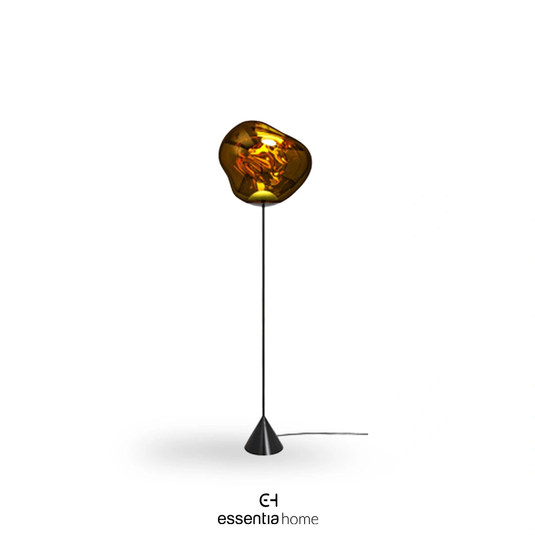 Standing gracefully on a sleek conical base, the Melt Cone Slim Floor Light rises tall and sophisticated, ideal for creating captivating corners in living rooms, lounges, and high-end hospitality spaces. Its golden finish radiates warmth and luxury, scattering distorted reflections that enhance the atmosphere with depth and brilliance.