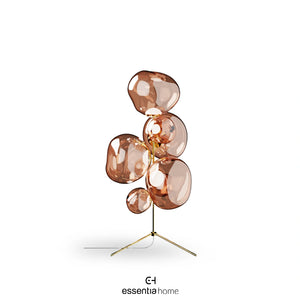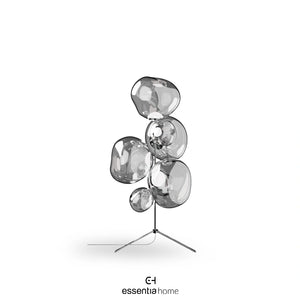Designed by the visionary Tom Dixon, the Melt Floor Chandelier in Silver is a captivating exploration of form, reflection, and light. Its semi-translucent, organic orbs transform dramatically with illumination—appearing as mirrored chrome when unlit, but unveiling a fiery, molten glow once lit. This dynamic interplay of distortion and brilliance elevates it beyond functionality into a statement of sculptural art.