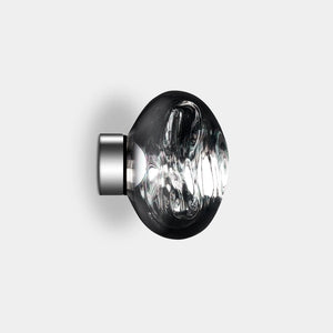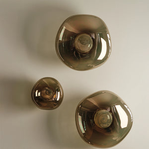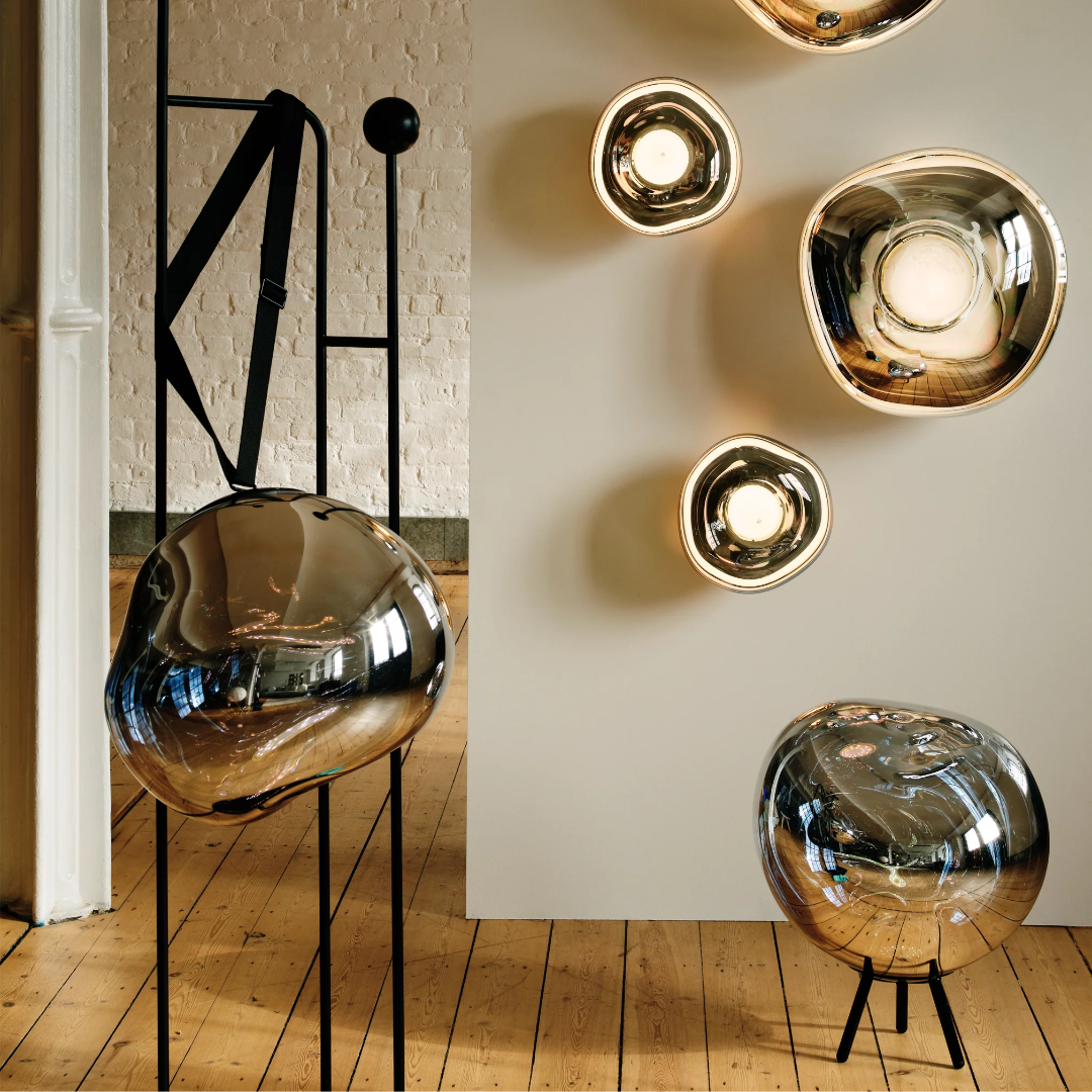 Melt is evocative of molten glass, the interior of a melting glacier or images of deep space. An imperfect, organic and naturalistic light that produces a mesmerizing hot-blown glass effect. Melt is created through a process of blow moulding and vacuum metallisation to achieve melted orbs with abundant and unusual luminosity. Here the orb sits on a cone-shaped base creating a striking silhouette.