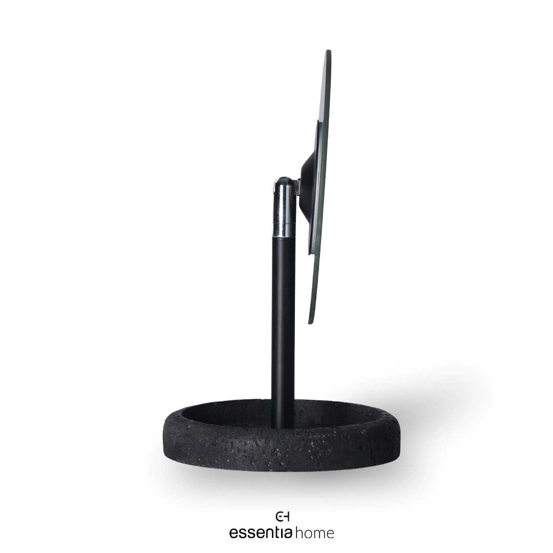 White marble base with black metal rod and circular glass mirror