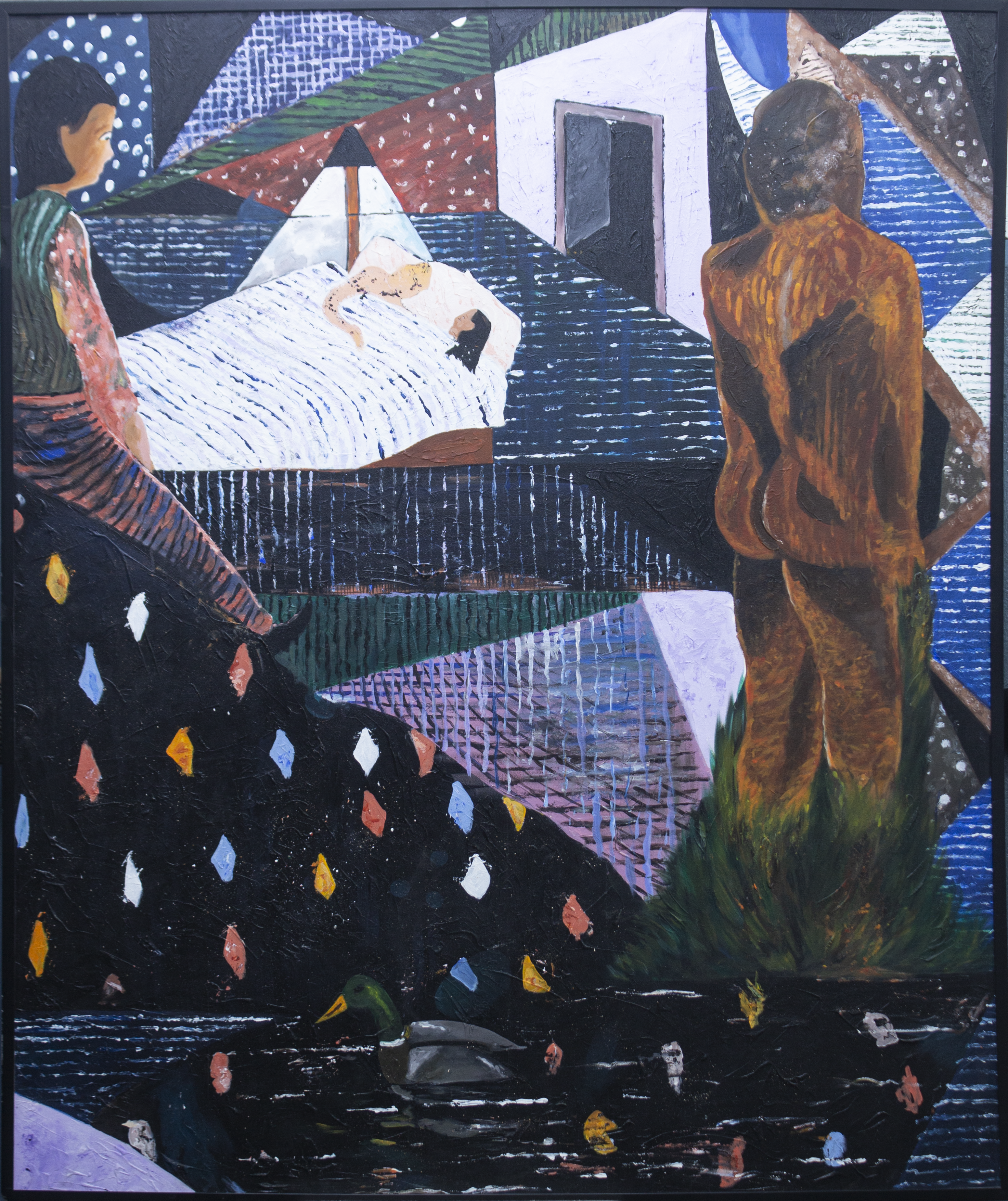 This vivid artwork explores the boundary between sleep and wakefulness. Depicting a figure resting in bed while surrounded by fragmented, surreal scenes, the piece reflects a dreamlike narrative. The use of bold textures, geometric patterns, and contrasting colors conveys a sense of tension and ambiguity, inviting viewers to interpret the unfolding visual story.