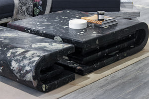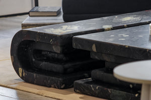 A striking statement of contemporary elegance, the Essentia Home’s Monolith Coffee Table is a seamless blend of architectural form and artistic craftsmanship. Crafted from black terrazzo stone, its bold presence is elevated by a luxurious leather polish, creating a tactile experience that exudes sophistication. The sleek matte black metal skirting adds a modern contrast, enhancing its sculptural appeal.