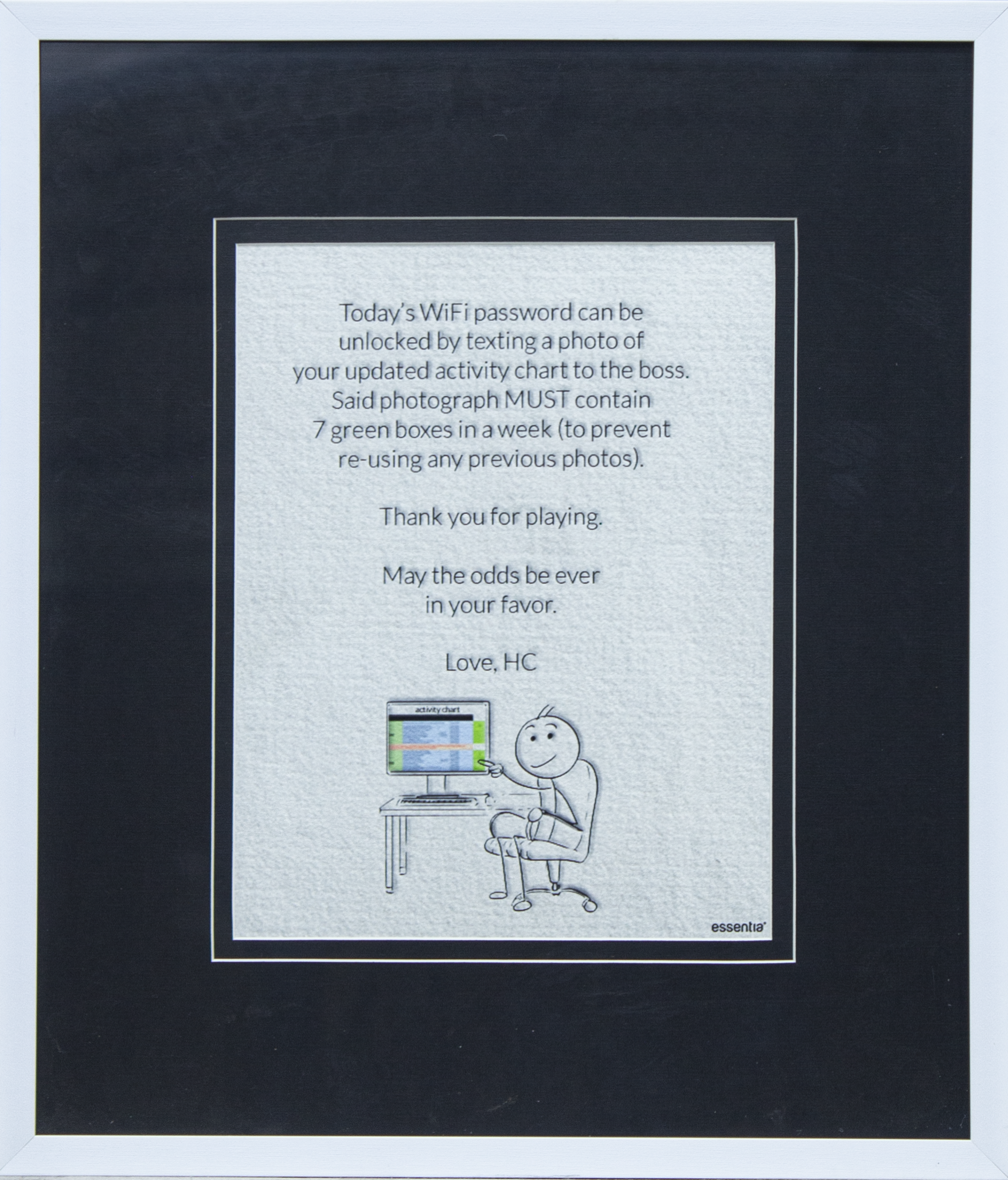 This playful and motivational artwork combines humor with a modern work ethic, depicting a note about unlocking the day's WiFi password through meeting activity goals. The lighthearted tone, complemented by a simple cartoon illustration, makes it a perfect addition to contemporary office spaces. It encourages productivity while adding a touch of fun and engagement to the workplace environment.
