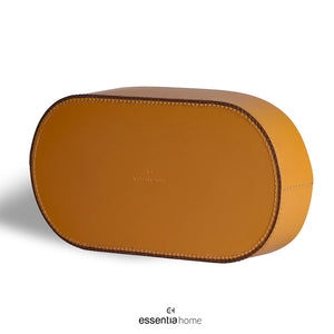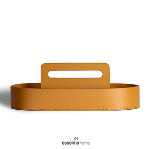 Crafted in rich tan vegan leather with meticulously hand-stitched edging, the tray’s structured oval shape features a cut-out center handle for easy movement—balancing sculptural beauty with tactile utility. Its soft curves and minimal design mirror the warm, understated aesthetic of Essentia Modern Living, and reflect the detail-oriented styling seen in spaces by Essentia Interiors Delhi NCR.