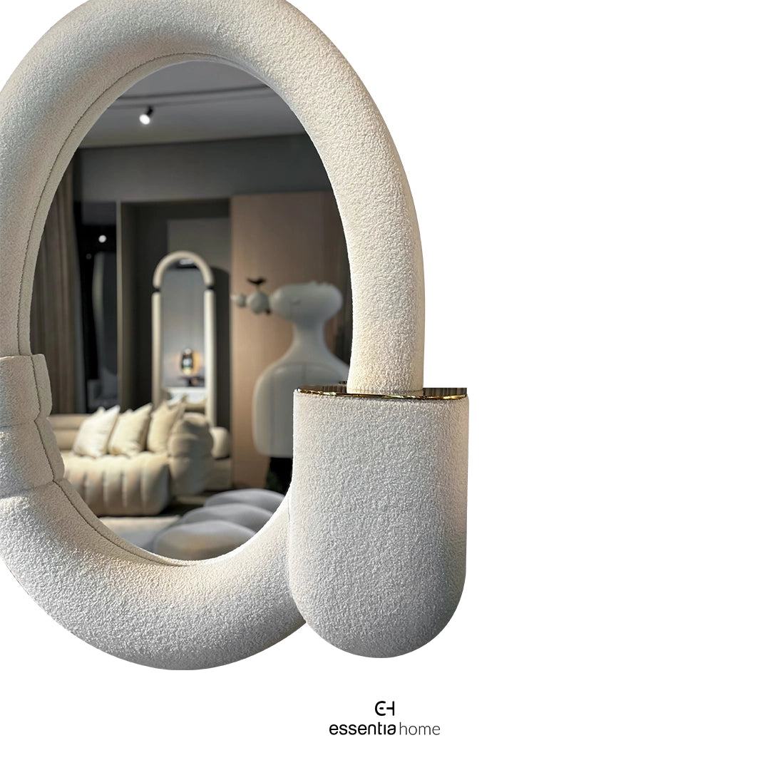Monica Chawla's Oval mirror is not merely an object of glass to reflect back; instead, it is an art piece to be experienced sensorially that mingles materiality and reflection. As a sculptural object, it articulates tactile softness in cloth contrasted with radiant beauty of reflecting metal, becoming an artwork unto itself that transcends mere practicality to an announcement in space.