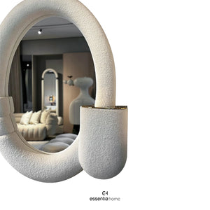The classically oval shape of the mirror brings balance and rhythm to any setting, while the frame is delicately articulated, revealing layered textures that may be described as refined and earthy. In the combination of textile and metal lies depth--an invitation to touch and contemplate rather than a mere pleasure for the eye.