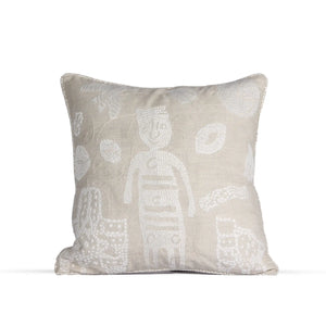 Enrich the luxury home accessories collection with quiet sophistication and symbolization through the Essentia Home Positive & Negative Cushion Cover. Designed with soft-beige linen, this designer cushion cover boasts minimalist thread embroidery abstractly depicting man-human figures and natural elements creating an impressive high-contrast textile artwork.
