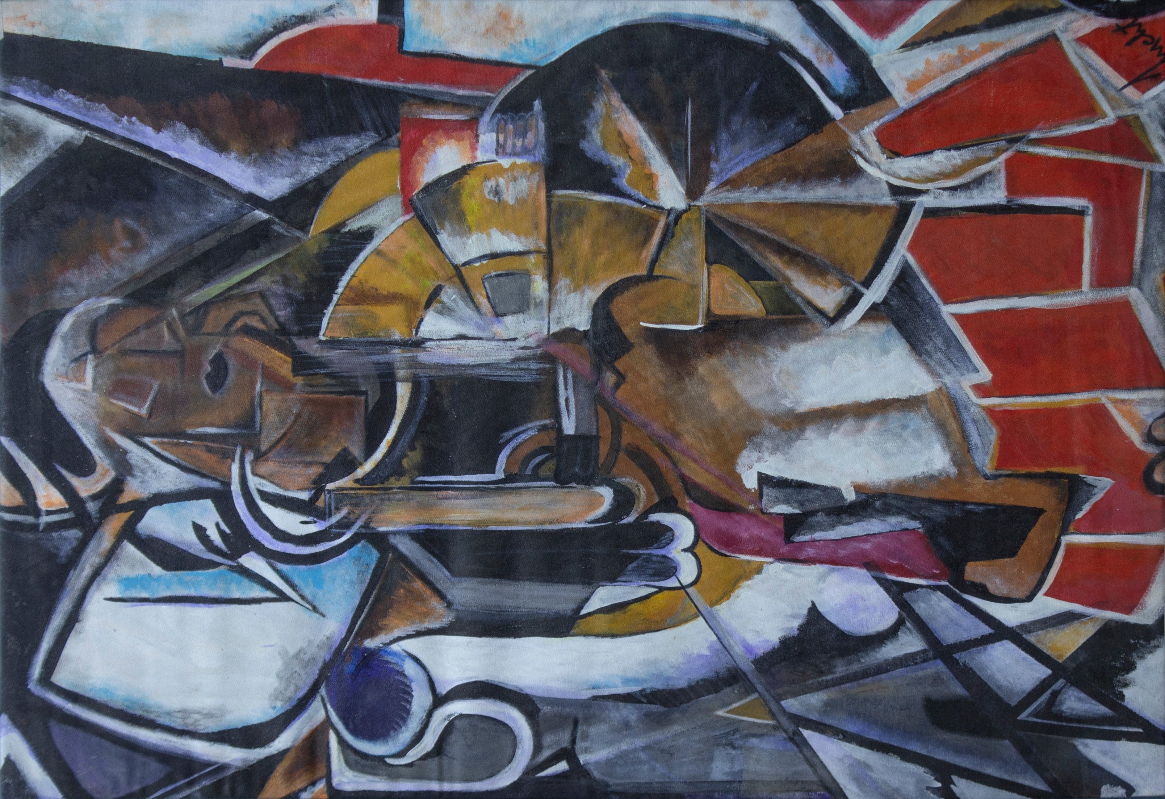 Engaging artwork that blends geometric shapes and a rich palette of colors to create a vibrant and dynamic composition. The overlapping forms and fluid lines suggest movement and energy, inviting viewers to experience the painting's harmonious interplay of abstraction and rhythm.