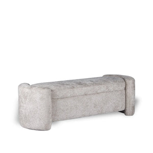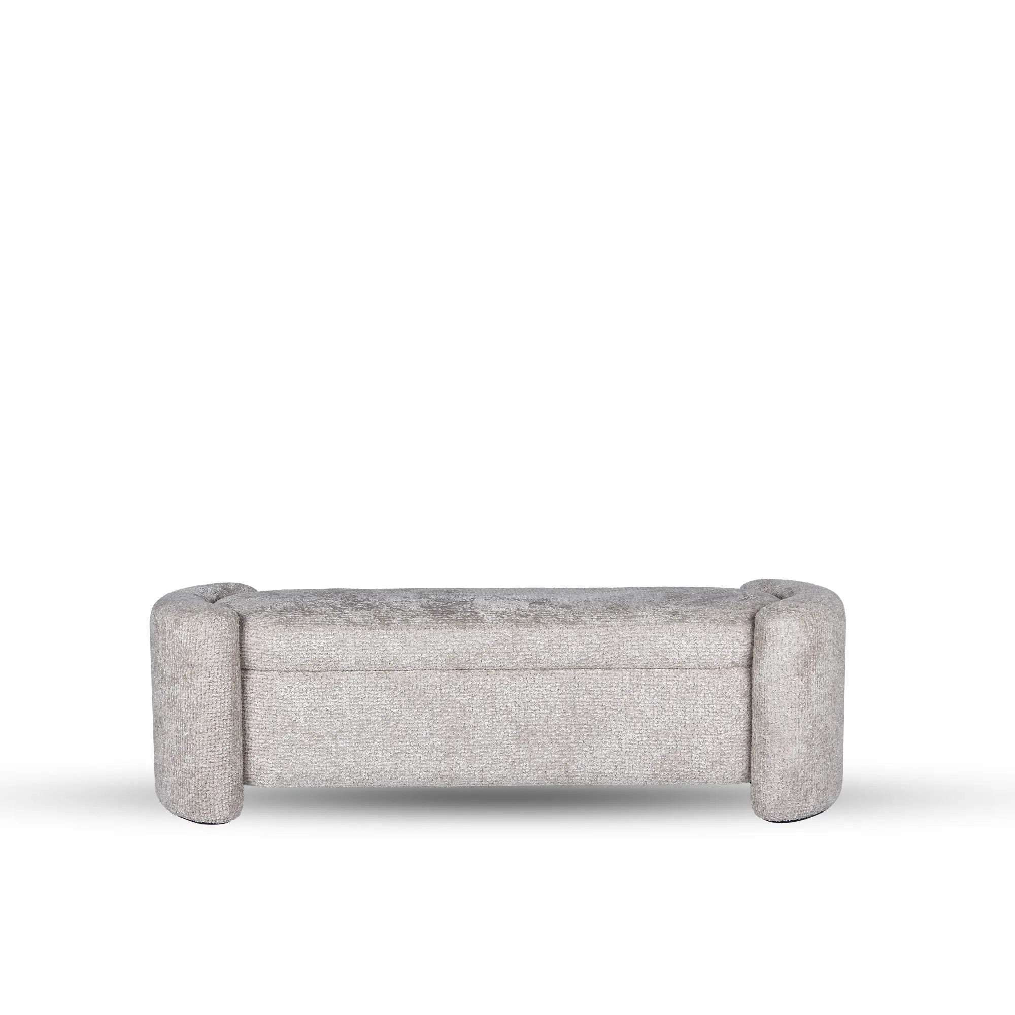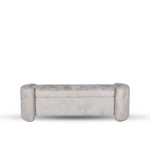 This piece has the potential as a position as a bench at the foot of a bed in a more functional sense, providing extra seating space in a lounge, or offering a sculptural surface onto which layered styling elements may be settled. It boasts proportions that are simultaneously generous and mindful of space, spurring visions of compact apartments or roomy suites into action.