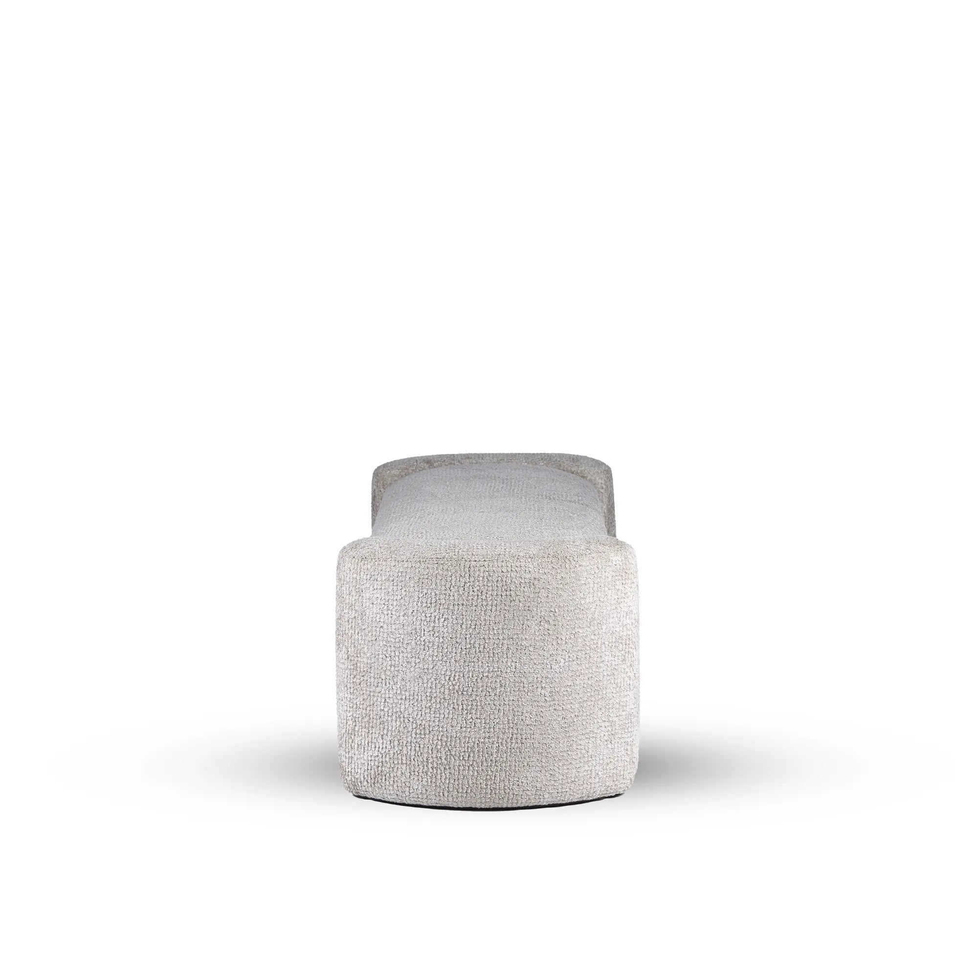 With its soft, sculptural forms and fine detailing, this upholstered ottoman contributes to a hush of contemporary living. Designed with curved edge profiles and a richly textured grey fabric upholstery, it combines plush comfort with architectural elegance to act as an anchor to any bedroom, lounge, or open floor space between them.
