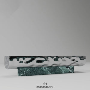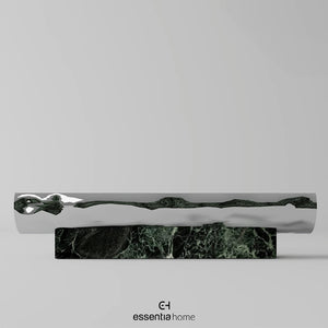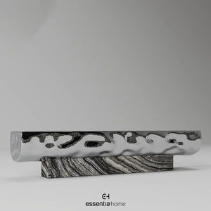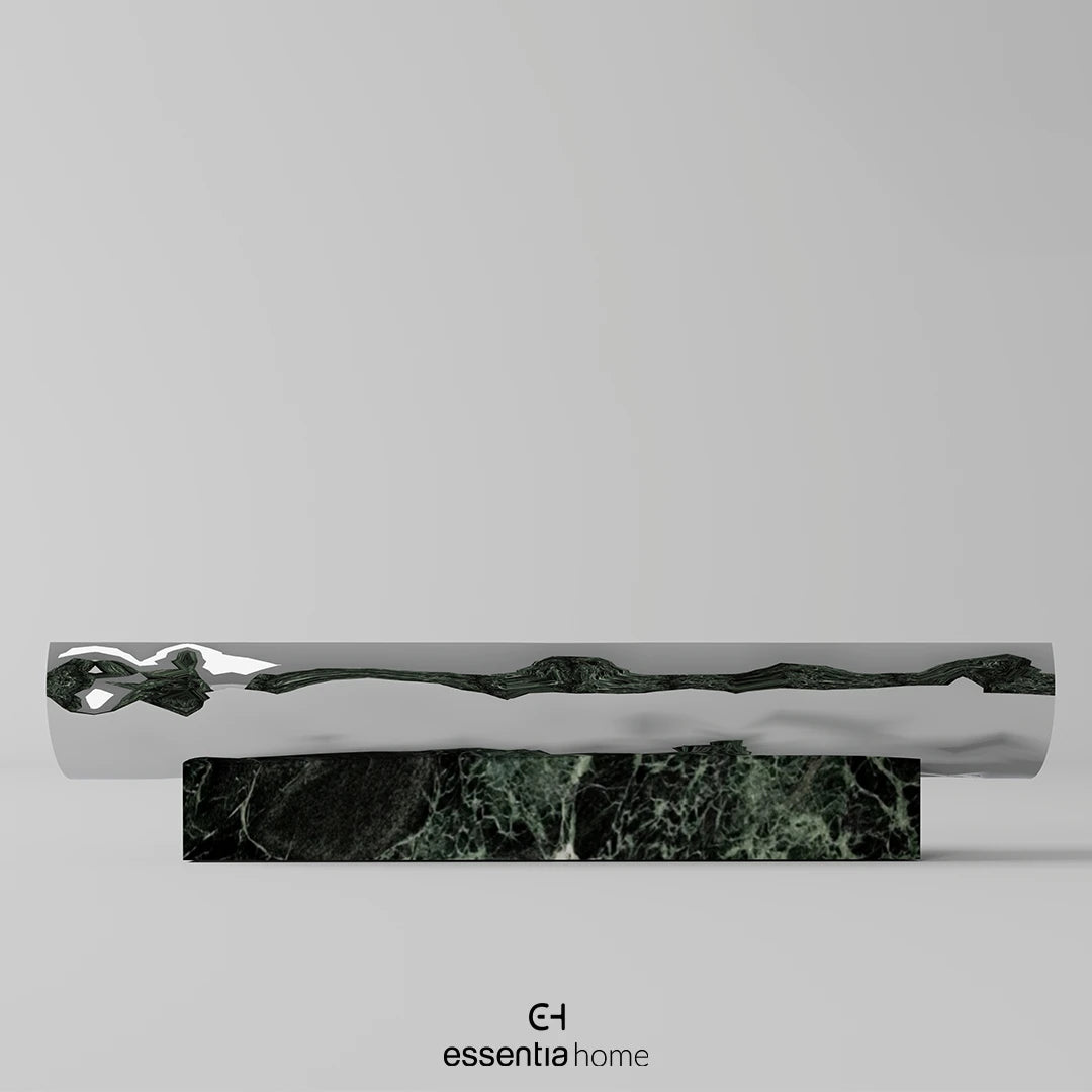 Elevate your bench design with this artful bench leg from Essentia Home—a bold fusion of organic elegance and material mastery. Measuring L: 3'-5" D: 0'-8" H: 0'-10", this design-forward leg combines the raw beauty of natural stone with the reflective allure of high-polish metal.