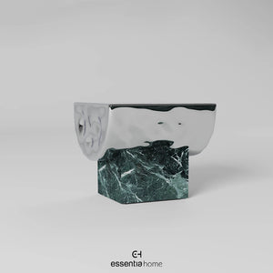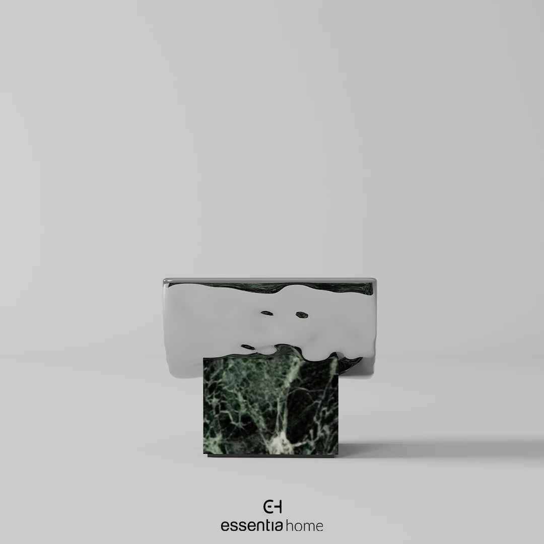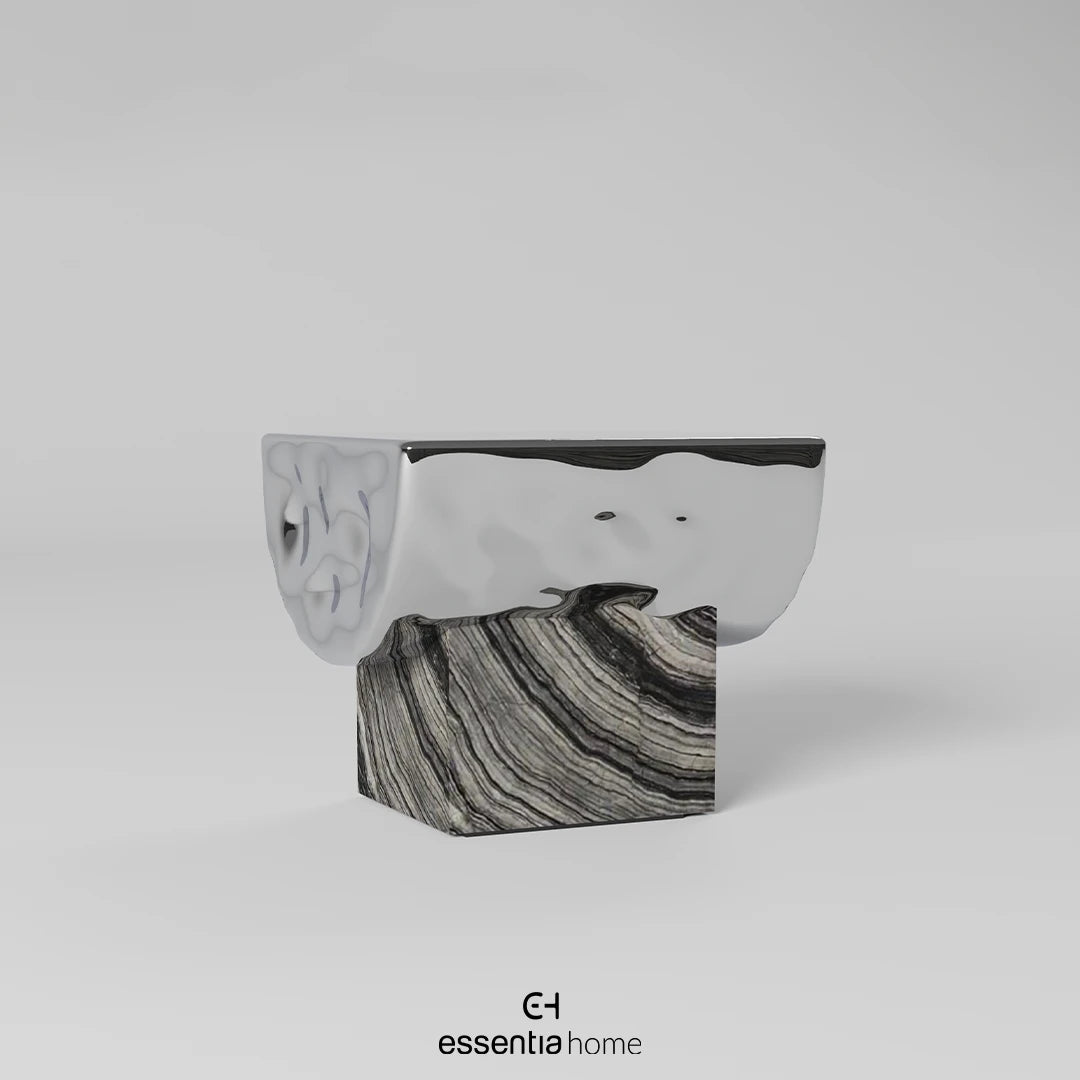 Whether used as a base for a side table or a standalone design feature, this piece reflects Essentia Home’s signature approach to sculptural metal furniture. The bold veining of the stone injects a sense of natural movement, enhancing the elegance of custom marble furniture while staying true to the principles of modern design.