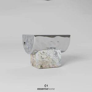 Designed as a statement piece for contemporary interiors, this sculptural side table leg blends the art of form and material. The hand-polished chrome top mimics molten metal, introducing a futuristic gloss that contrasts strikingly with the banded marble base below. Its compact size and geometric silhouette make it the perfect accent for luxury living rooms, bedrooms, or lounges.