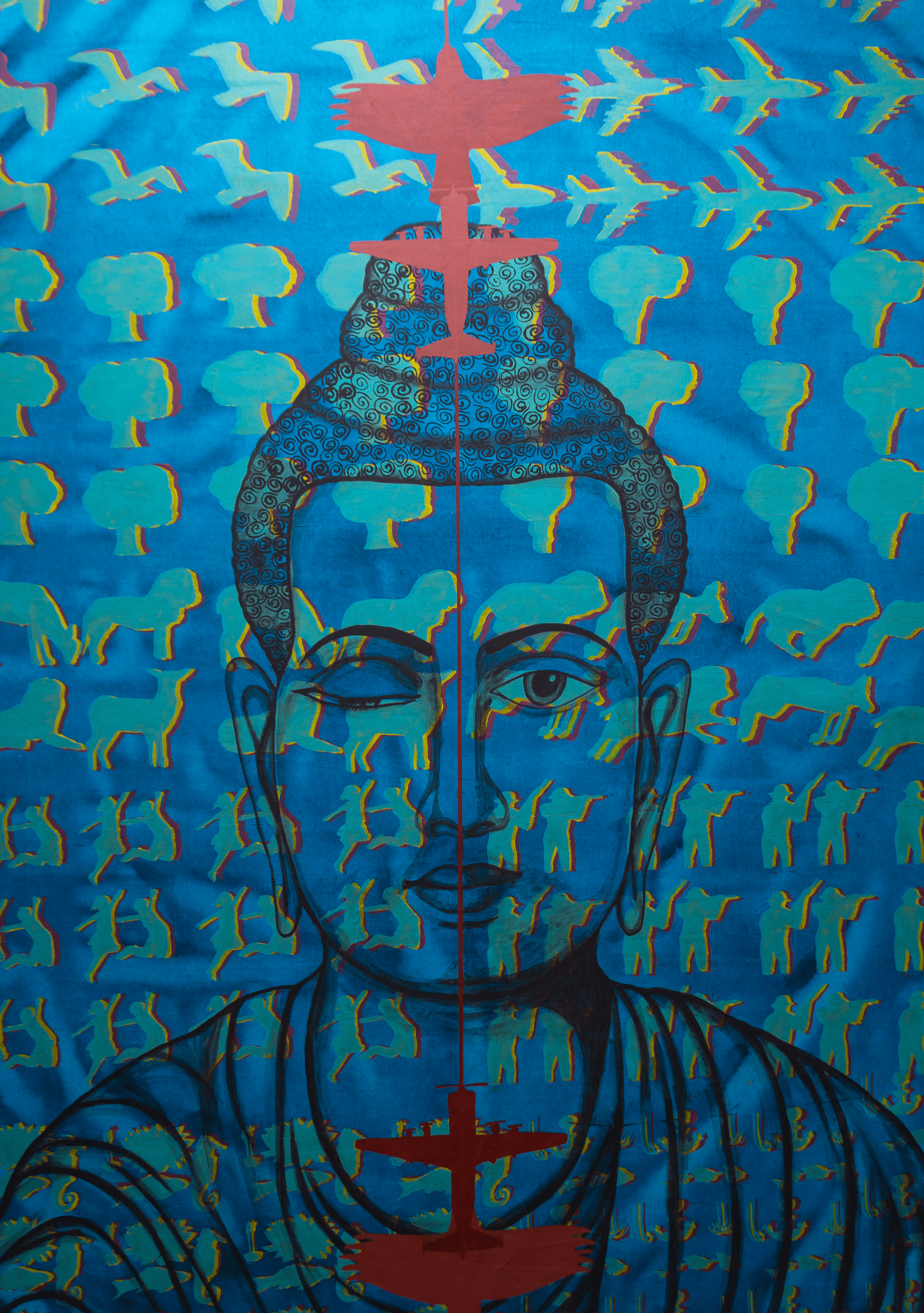 This captivating artwork combines vibrant symbolism, showcasing a serene Buddha figure amid dynamic forms of birds, animals, and trees. The juxtaposition of motion and tranquility explores the duality between inner calmness and external chaos. The bold colors and layered imagery evoke a powerful sense of balance, inviting contemplation of the complex relationship between peace and life’s relentless activity.