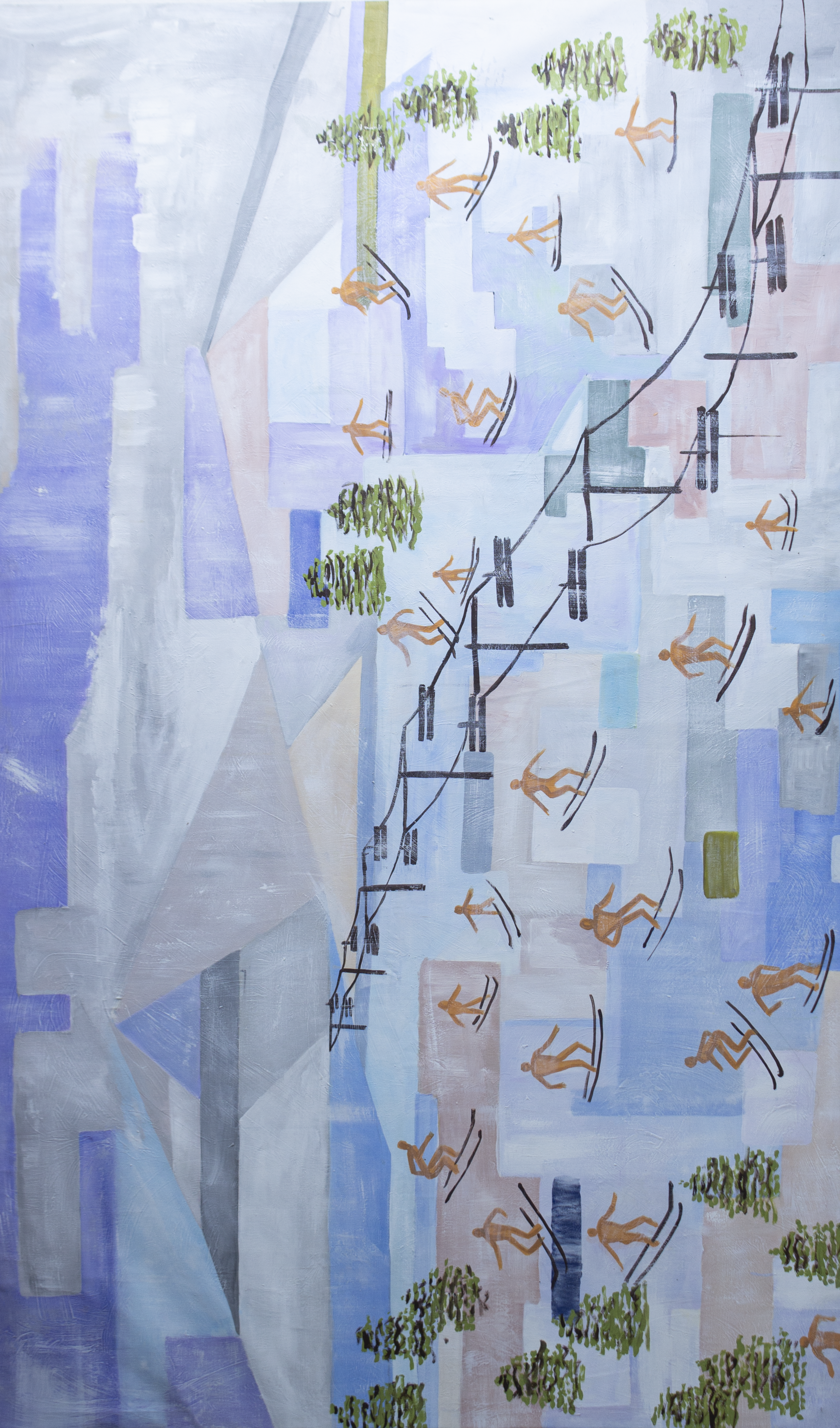 This abstract composition captures a sense of vertical movement, blending geometric forms with skier-like figures that glide down unseen slopes. Soft pastel tones contrast with defined lines, creating a dynamic interplay between nature and urban structures. The balance of human figures and environmental shapes invokes a sense of harmony in an evolving landscape, offering a vision of both leisure and structure.