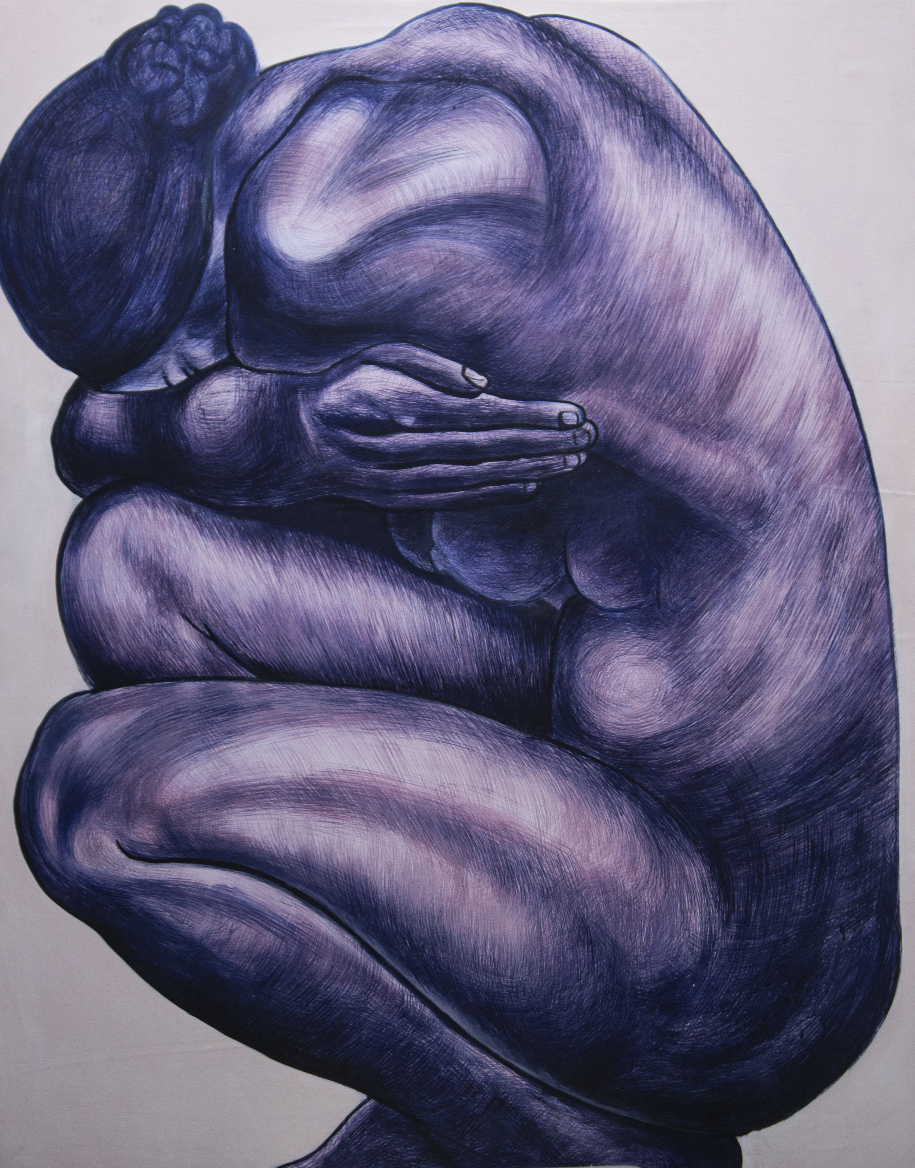 This powerful artwork captures the quiet intensity of the human form in a fetal pose, wrapped in shades of deep purple. The intricate detailing of the figure's muscles and body contours evoke a sense of vulnerability and self-protection, offering a profound reflection on solitude, inner strength, and introspection.