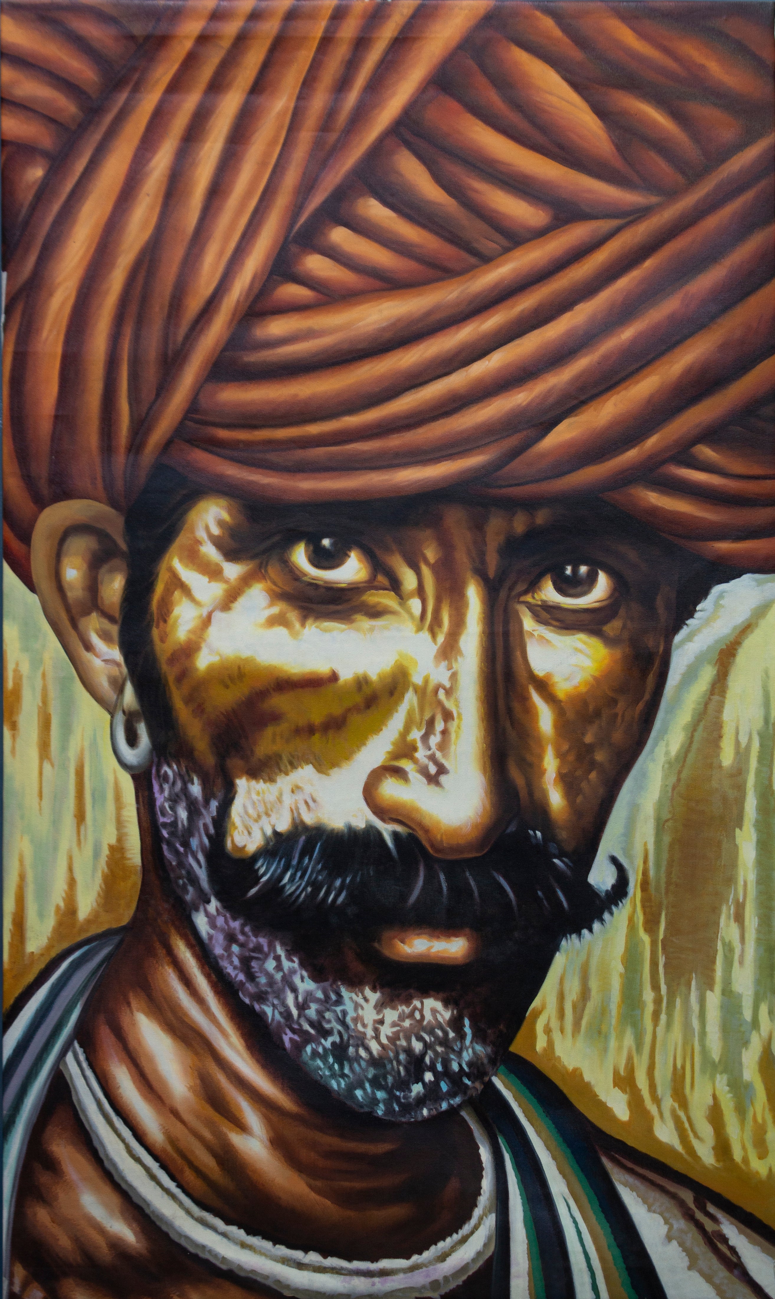 This striking portrait captures the intense gaze of a man adorned with a traditional turban and mustache, reflecting the cultural essence of desert life. The detailed textures and rich earth tones highlight the rugged features and weathered skin, evoking a sense of wisdom and resilience. The artwork conveys themes of identity, heritage, and the enduring spirit of rural communities.