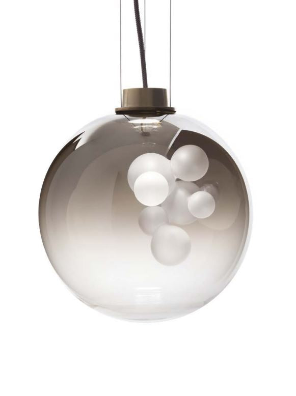 The Soap Sphere Suspension Light by Melogranoblu is a true work of art, whose breathtaking aesthetics are gracefully married to that of lighting. This incredible pendant lamp presents a metalized hand-blown glass sphere with an inner frosted bubble sculpture. The frosted sculpture creates enchanting effects as it interacts with light, casting a magical glow capable of mesmerizing the entire room.