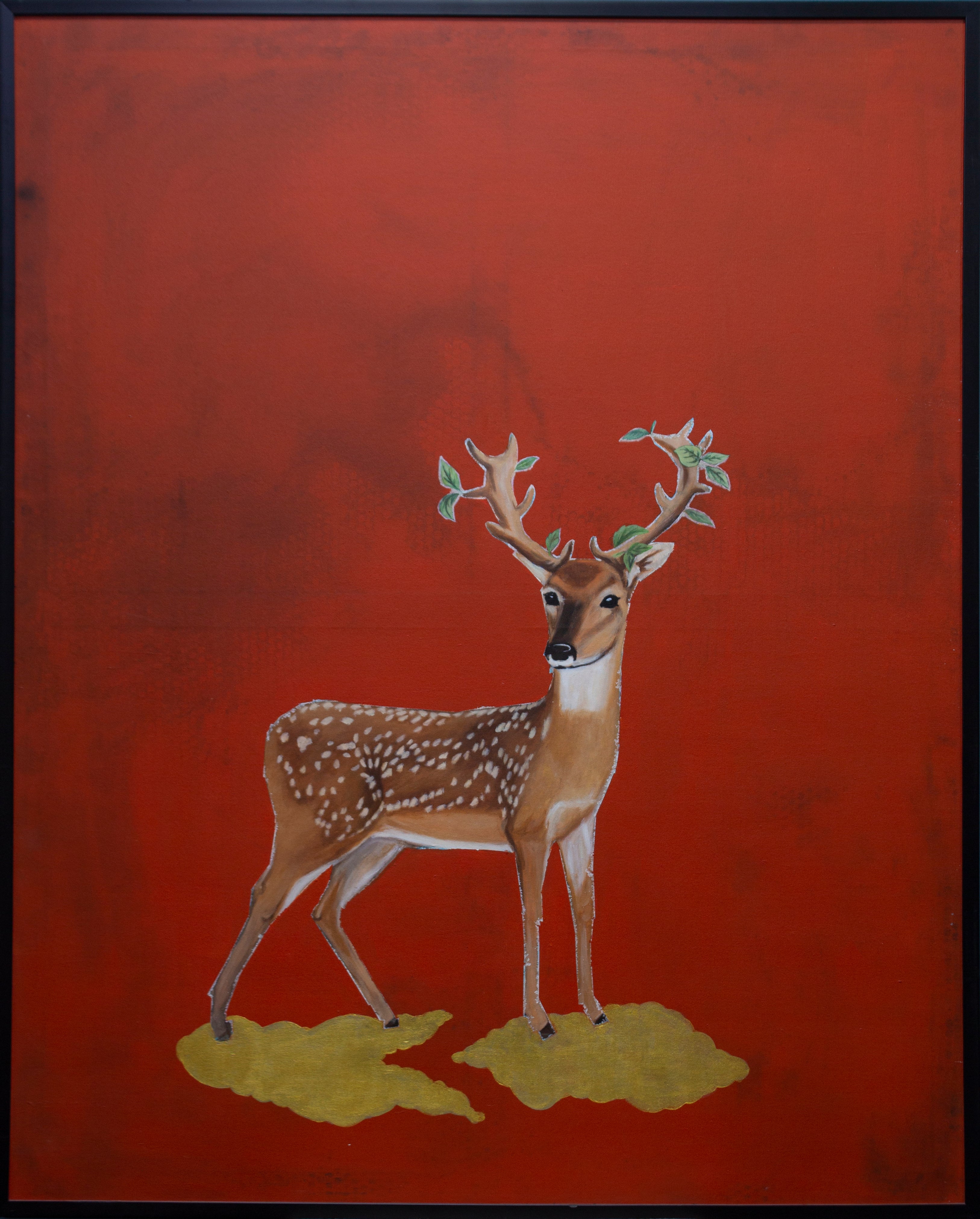 This artwork presents a solitary deer standing against a rich crimson background, highlighting its grace and natural beauty. The contrast between the animal's delicate form and the bold, solid backdrop emphasizes themes of isolation and the purity of nature. The piece invites contemplation on the connection between wildlife and its environment, evoking a sense of calm and introspection.