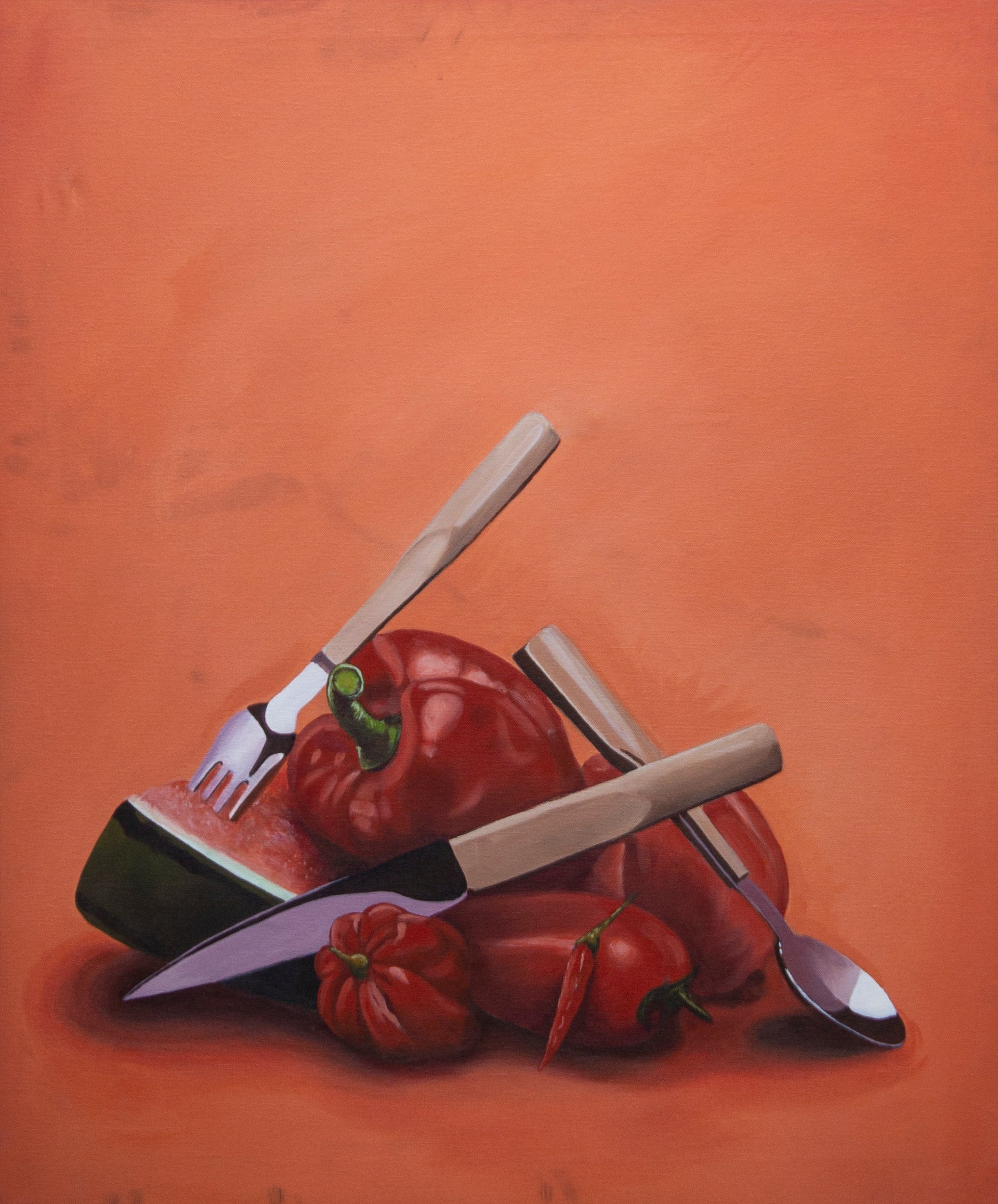 This still life artwork showcases a composition of red peppers, a knife, a fork, and a spoon against a warm orange background. The realistic rendering and balanced arrangement highlight the textures and shapes of everyday objects. The piece invites viewers to appreciate the simplicity and beauty in ordinary moments, celebrating the art of still life and domestic tranquility.