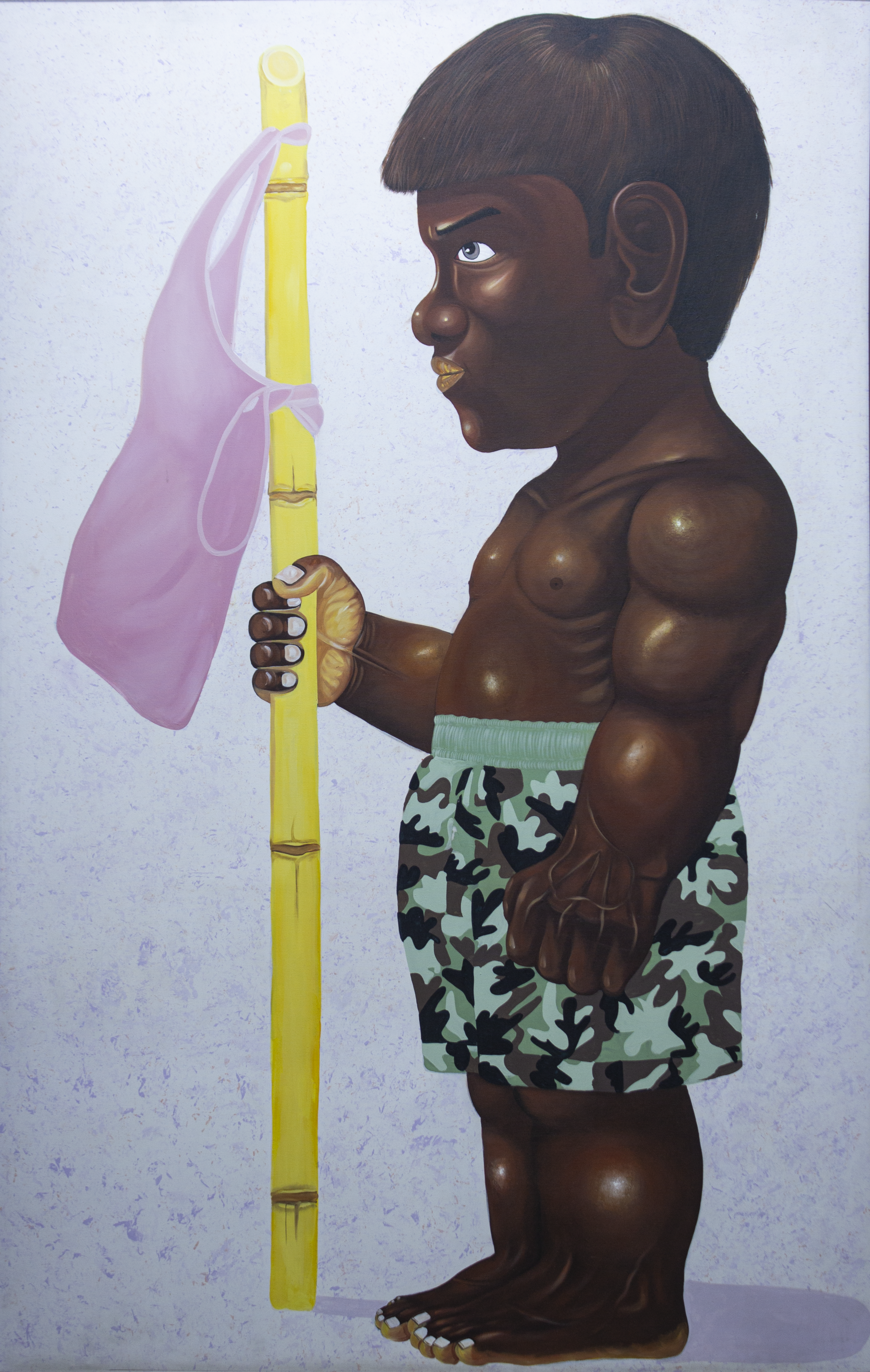 This artwork portrays a young boy standing confidently, his muscular form juxtaposed with a soft pink cloth tied to a bamboo stick. Dressed in camouflage shorts, he symbolizes a blend of vulnerability and resilience. The clean lines and bold colors reflect a powerful narrative of identity, innocence, and determination in a modern, playful style.