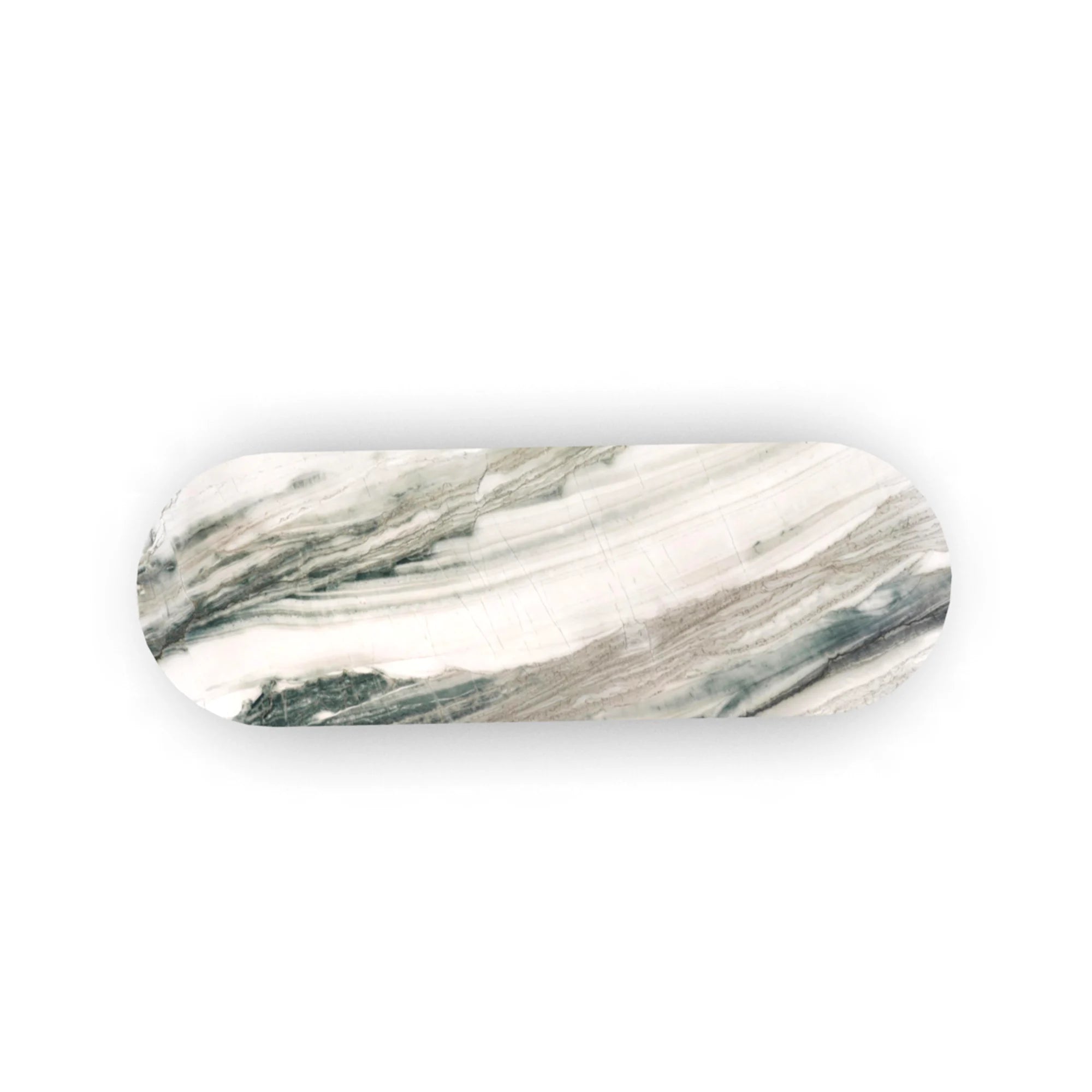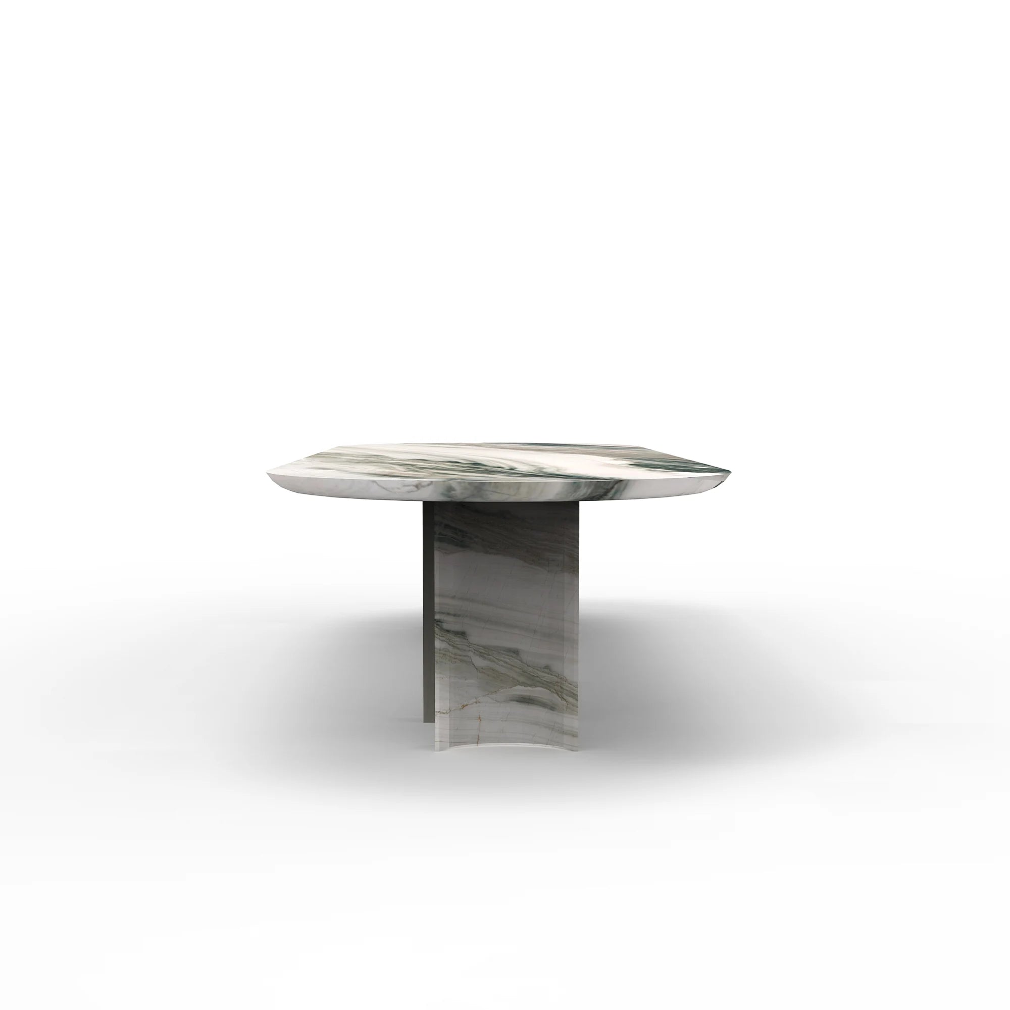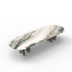 The tabletop, carved from Xabia Marble with a refined leather finish, features striking natural veining that enhances its organic appeal. The elongated silhouette and softened edges exude sophistication, making it an artful addition to any modern interior.
