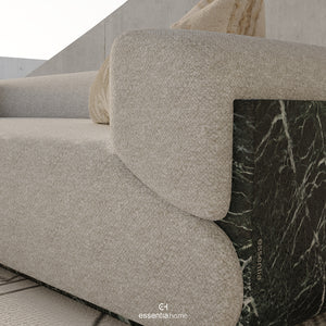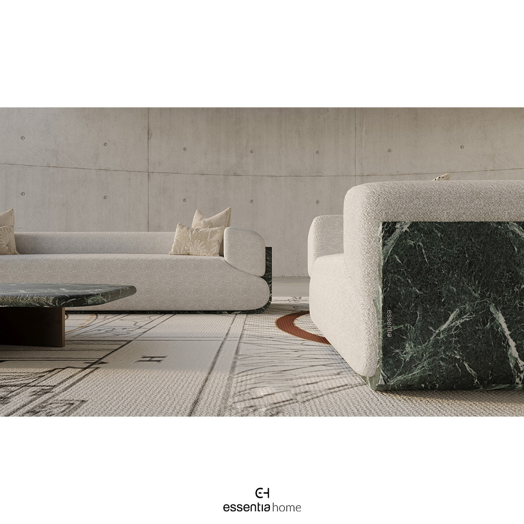 At the heart of the collection is the sculpted sofa set—designed with serene curves, deep seats, and subtle detail. The rear marble detailing adds an unexpected layer of quiet luxury, grounding the piece with material integrity and visual weight. Wrapped in soft neutral upholstery, the sofas and armchairs are built for both indulgent lounging and elegant entertaining.