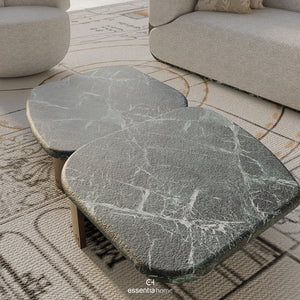 In dialogue with the seating is the twin-top coffee table—a duo of dark, natural stone resting gently on a metallic base. Organic yet precise, their unique silhouettes bring a calm rhythm to the space, echoing the contours of the seating while adding contrast in tone and texture. Together, they become both functional anchors and visual centerpieces.