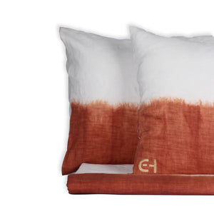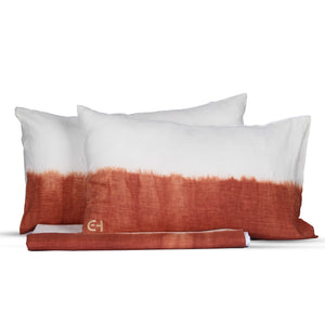 Hand-dyed for organic gradient shifts, this set captures the glow of autumn light and tactile warmth. The tonal “E+” embroidery acts as a subtle emblem of craftsmanship and curated living. Whether paired with rich wooden furniture or minimalist decor, the set introduces a balanced contrast to neutral walls and textures in luxury home interiors across Delhi, Gurgaon, or Noida.