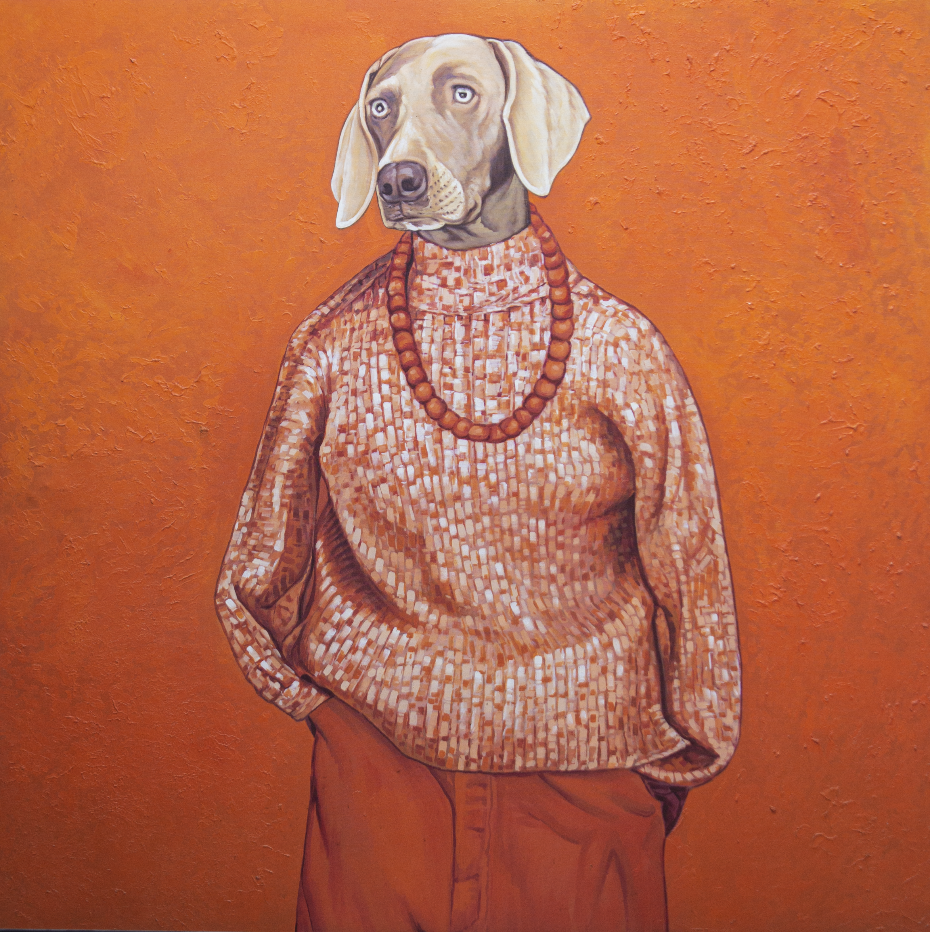 This quirky and imaginative portrait features a dog, dressed in fashionable attire, exuding a sense of style and confidence. The vibrant orange background complements the textured outfit, creating a unique blend of humor and sophistication. The piece playfully explores the intersection of human and animal characteristics, making a bold artistic statement. 5 x 5
