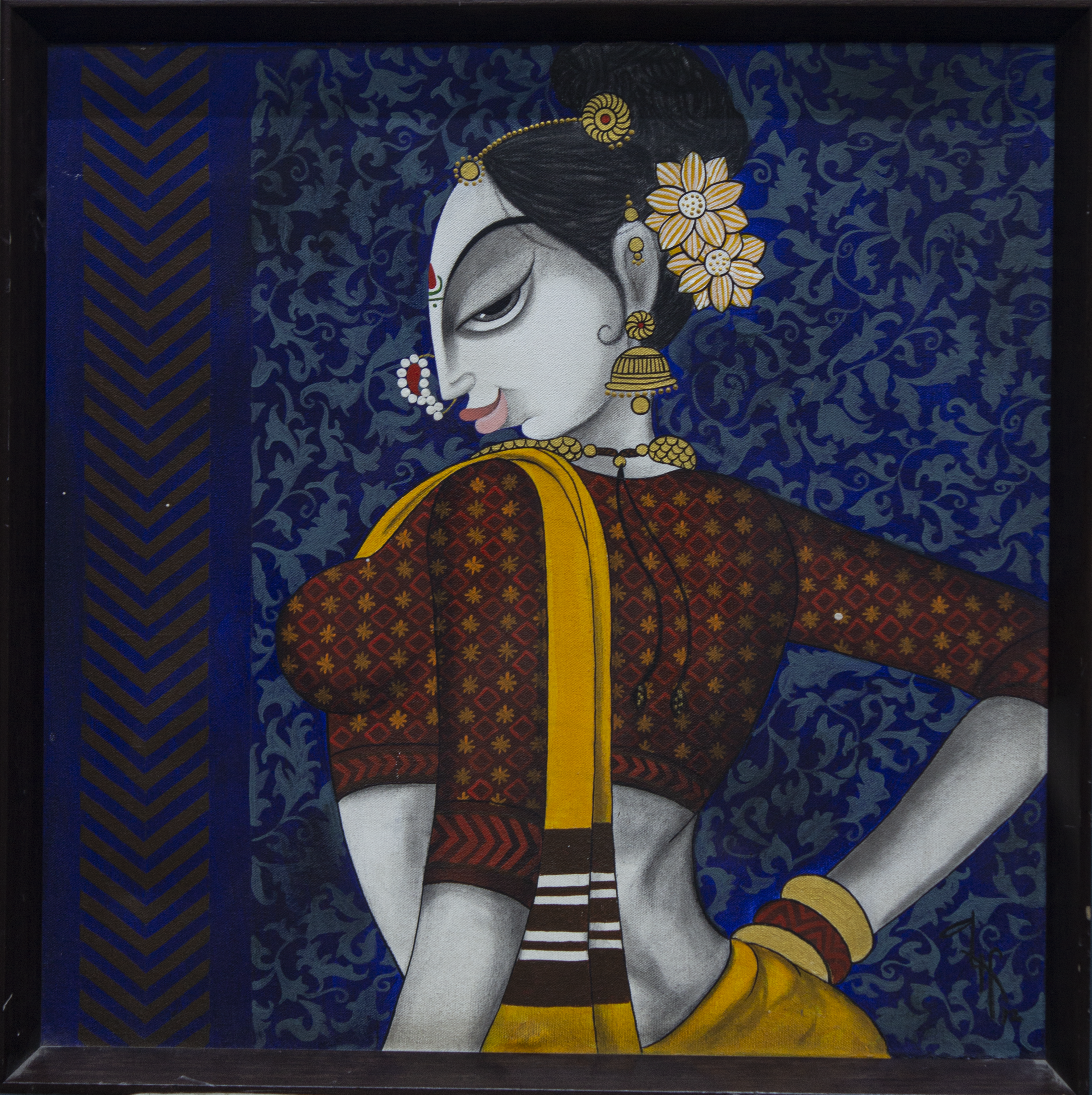 This artwork captures the elegance and mystique of traditional Indian beauty. The intricate patterns of her attire, combined with the delicate floral details, highlight the sophistication of feminine charm. The vivid colors and bold contours make this a striking piece, reflecting the rich cultural heritage with a modern aesthetic appeal.
