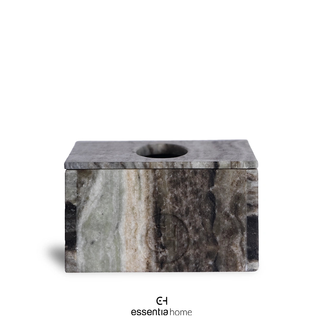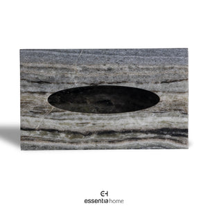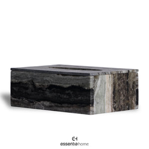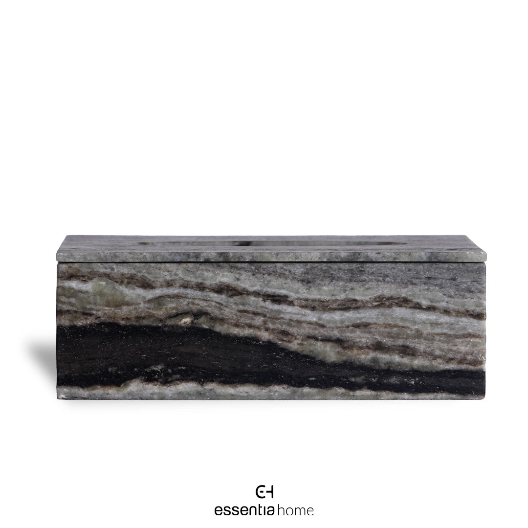 This tissue box crafted from Black Forest Stone is an essential item for every modern interior. It brings a raw and natural beauty into your everyday spaces. Made from richly layered Indian marble, the ash, evergreen, and charcoal hues along with intertwining mossy veins showcase the uniqueness of natural stone textures. This decor accent becomes a subtle sculpture on vanity tables, consoles, and nightstands.