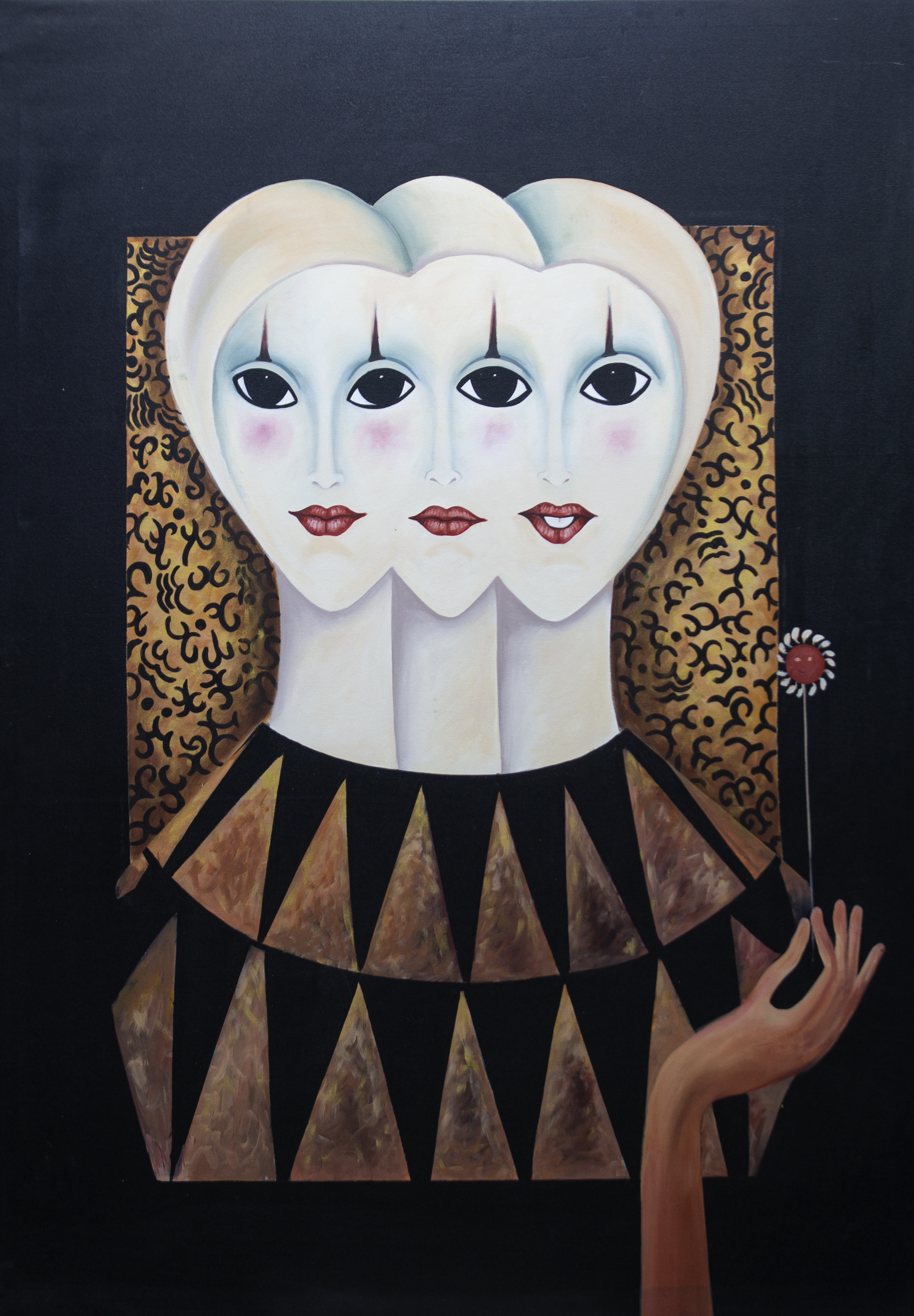 This surreal artwork presents a striking fusion of three identical faces, symbolizing unity, perception, and elegance. The soft, pale tones contrast with bold geometric patterns, creating a balance between abstraction and identity. The hand offering a single flower adds a touch of delicate mystery, inviting interpretation while drawing attention to the harmonious flow of this captivating composition.