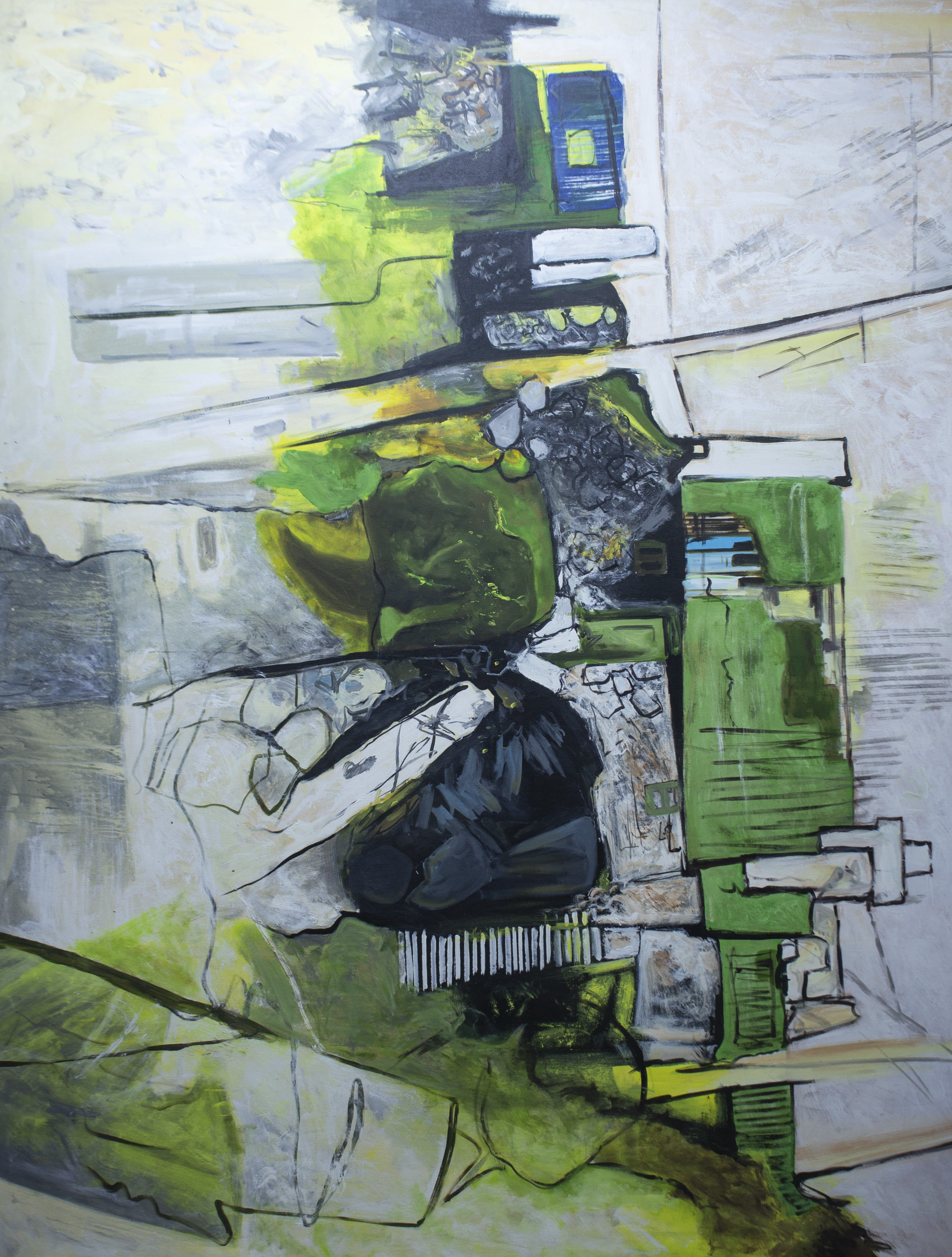 This abstract composition blends geometric shapes and earthy colors to depict a fragmented cityscape. The juxtaposition of textured surfaces and architectural elements conveys a sense of decay and renewal. The artwork invites viewers to interpret the layers of urban experience, highlighting themes of transformation, the passage of time, and the complex relationship between nature and human-made environments.