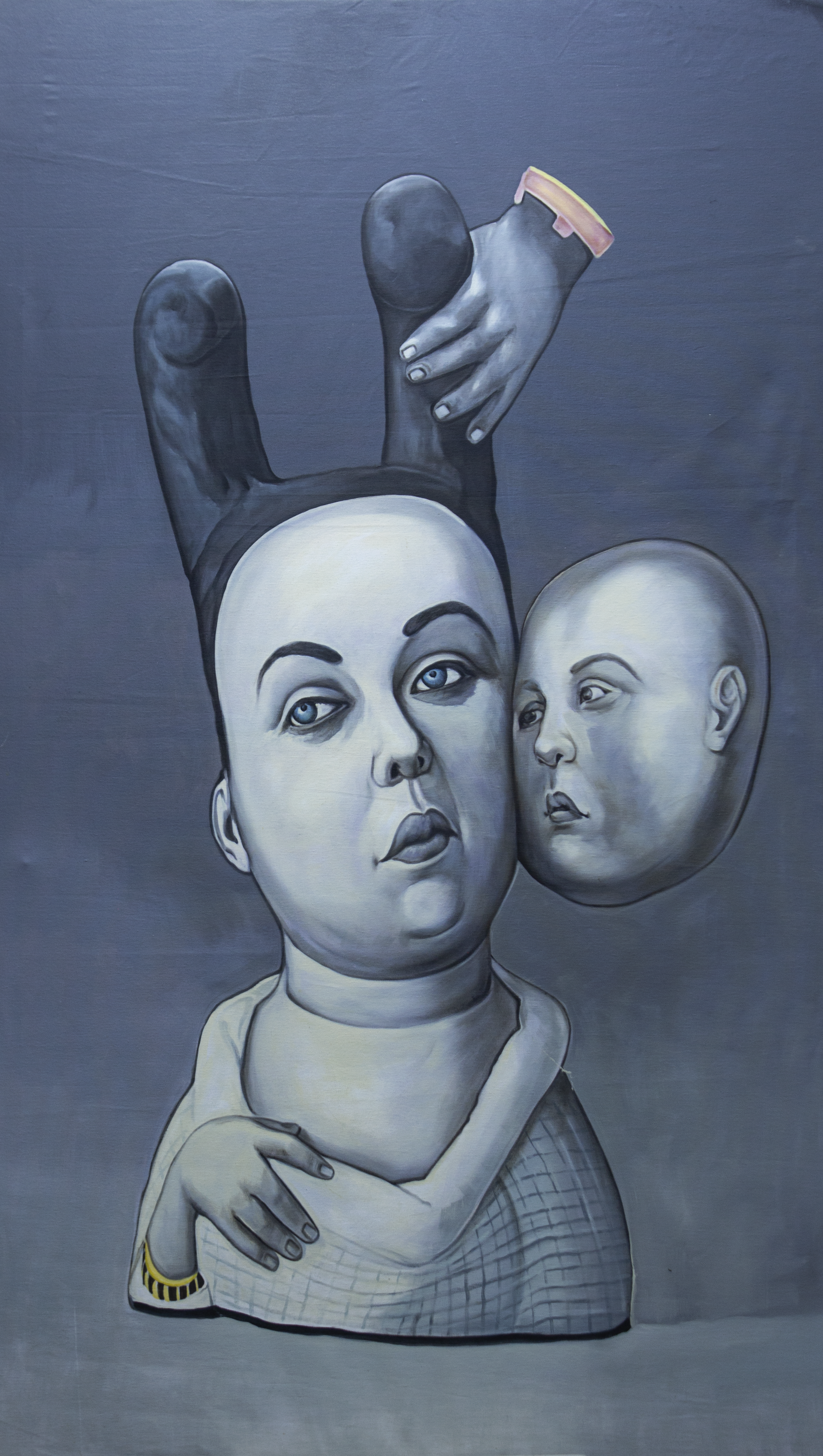 This surreal composition explores the complexities of self and the delicate interaction between individuality and perception. The juxtaposition of disembodied heads and symbolic hands evokes a sense of introspection and emotional depth. Muted tones emphasize the introspective mood, while the unique forms suggest themes of transformation, growth, and inner dialogue.
