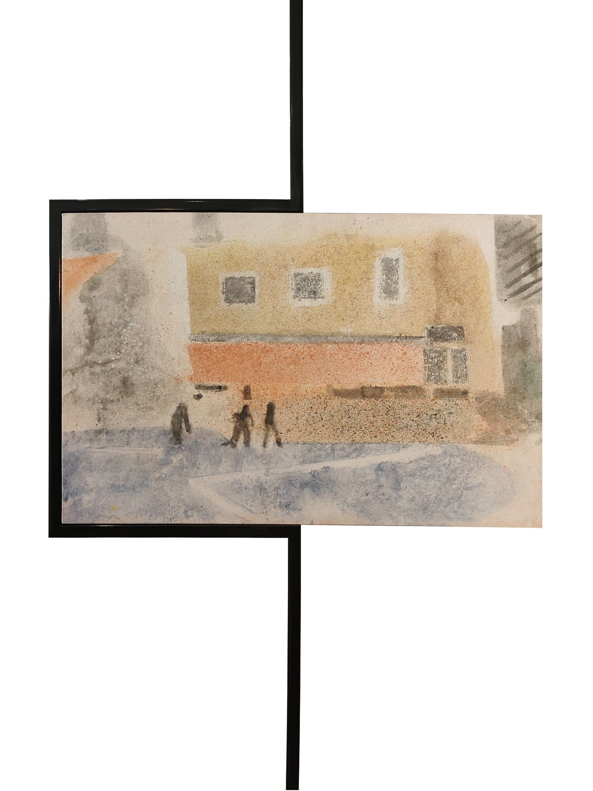 "Urban Stroll" depicts a serene moment in city life, capturing the subtle beauty of an everyday scene. The watercolor tones and soft textures convey a sense of calm