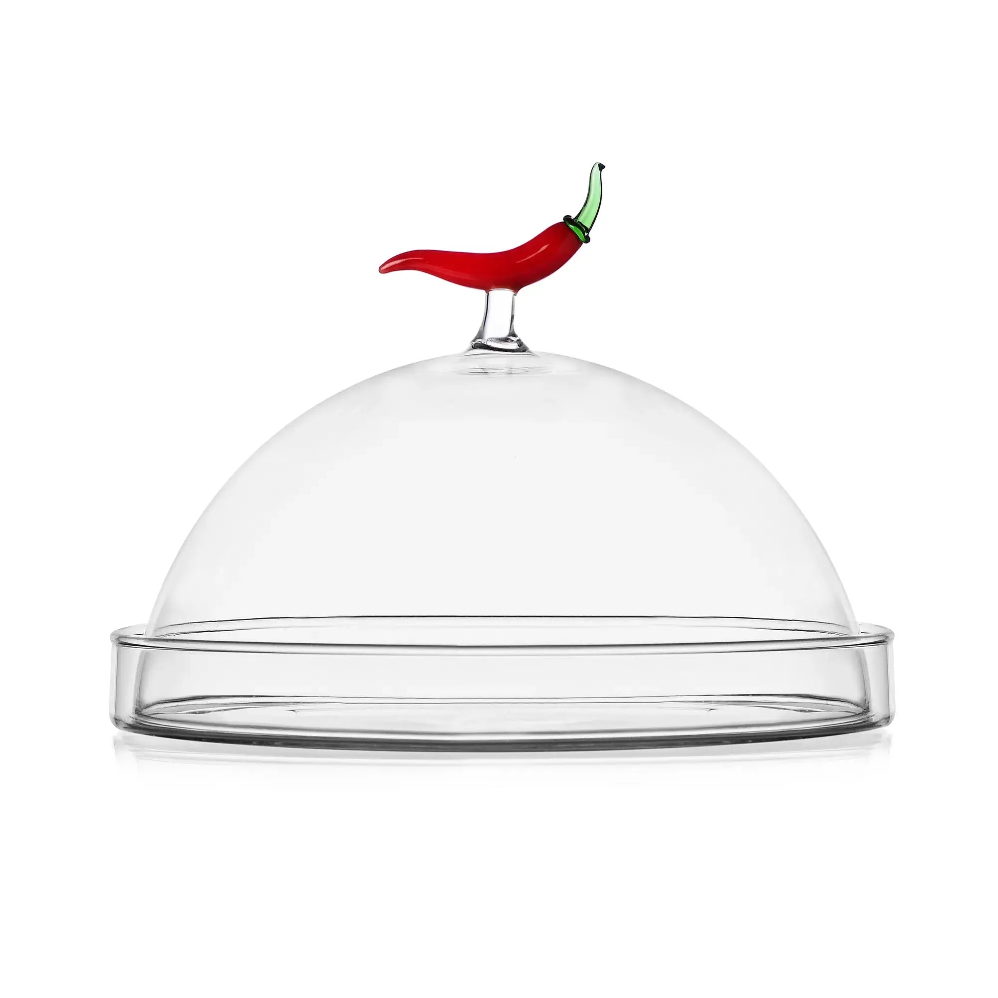 Handmade and flame-worked from fine glass, this striking piece pairs a clear dome and dish with sculptural red chili pepper accents, infusing the design with bold colour and whimsical charm. Its inventive details make it as decorative as it is functional, celebrating the artistry of handcrafted glass.