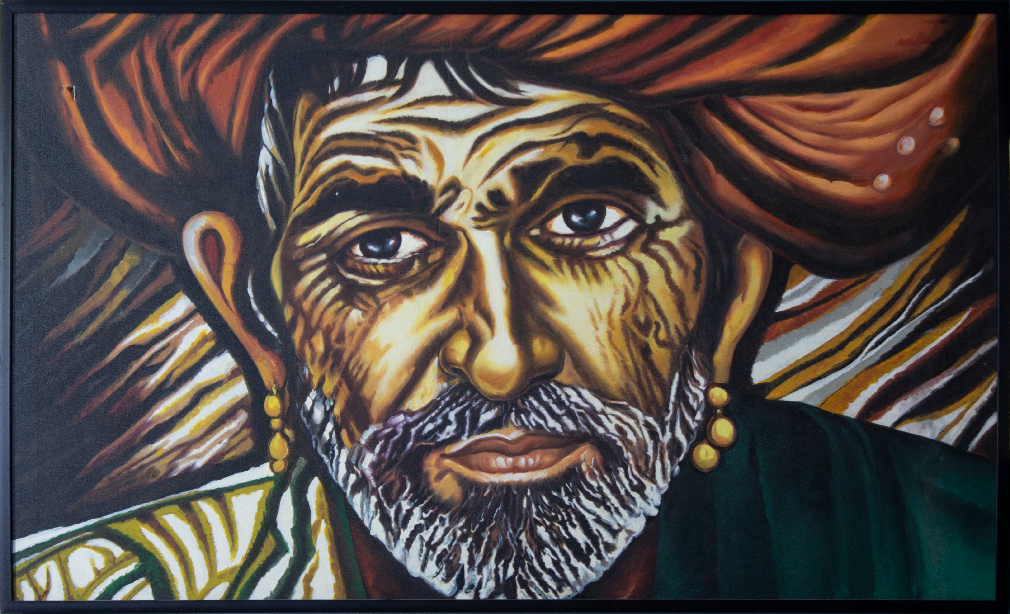 This striking portrait captures the intense, thoughtful gaze of an elderly man adorned with a traditional turban. The detailed lines and rich color palette emphasize the character and depth etched into his face, conveying a sense of wisdom and experience. The artwork reflects themes of cultural heritage, dignity, and the profound stories held within a person's eyes.