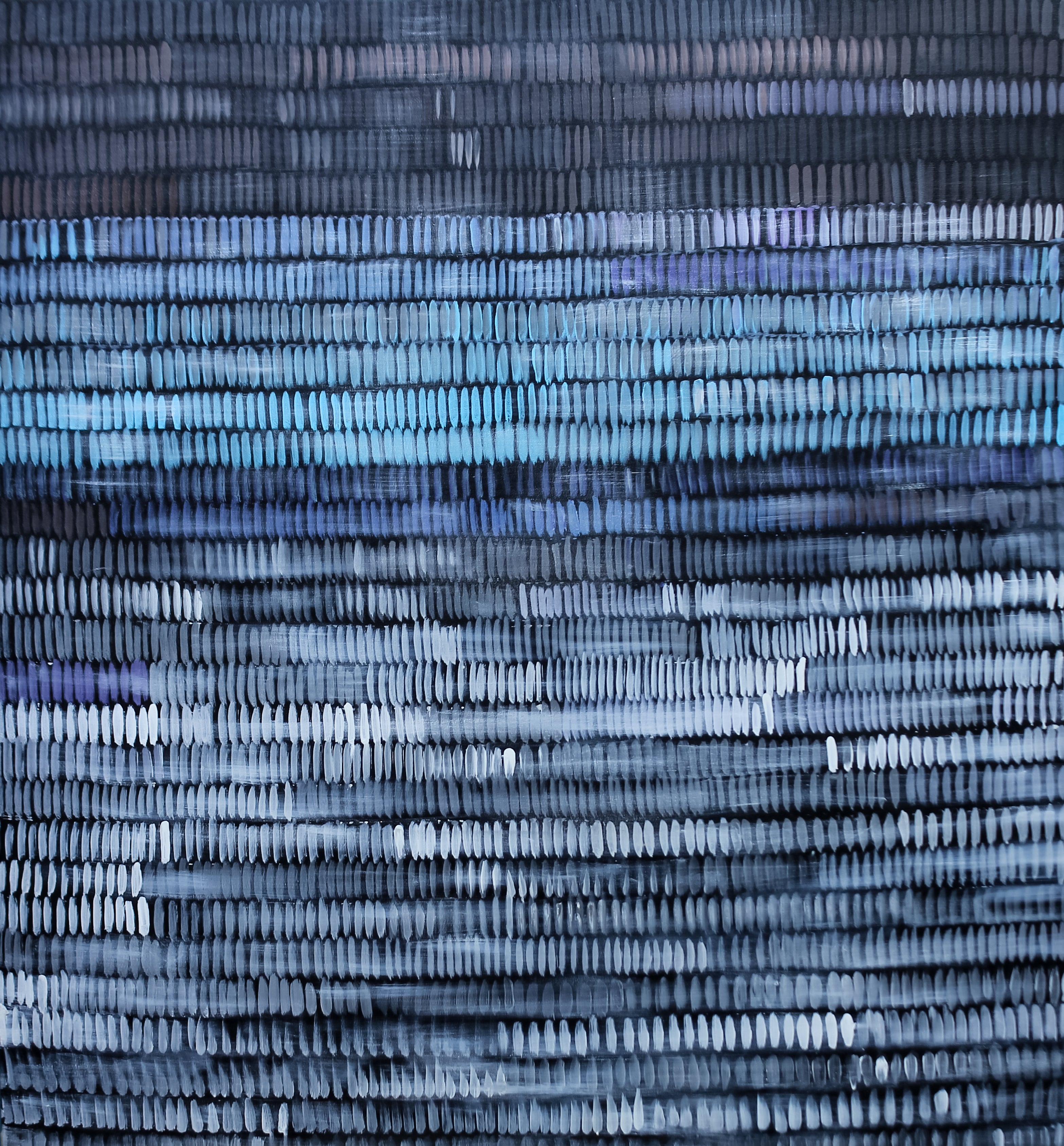 This abstract piece is characterized by horizontal lines and varying shades of blue, suggesting the movement of water or the tranquility of a quiet sea. The repetitive, textured strokes create a sense of rhythm and depth, drawing the viewer into a meditative state. The artwork explores themes of calm, continuity, and the soothing nature of repetitive patterns.