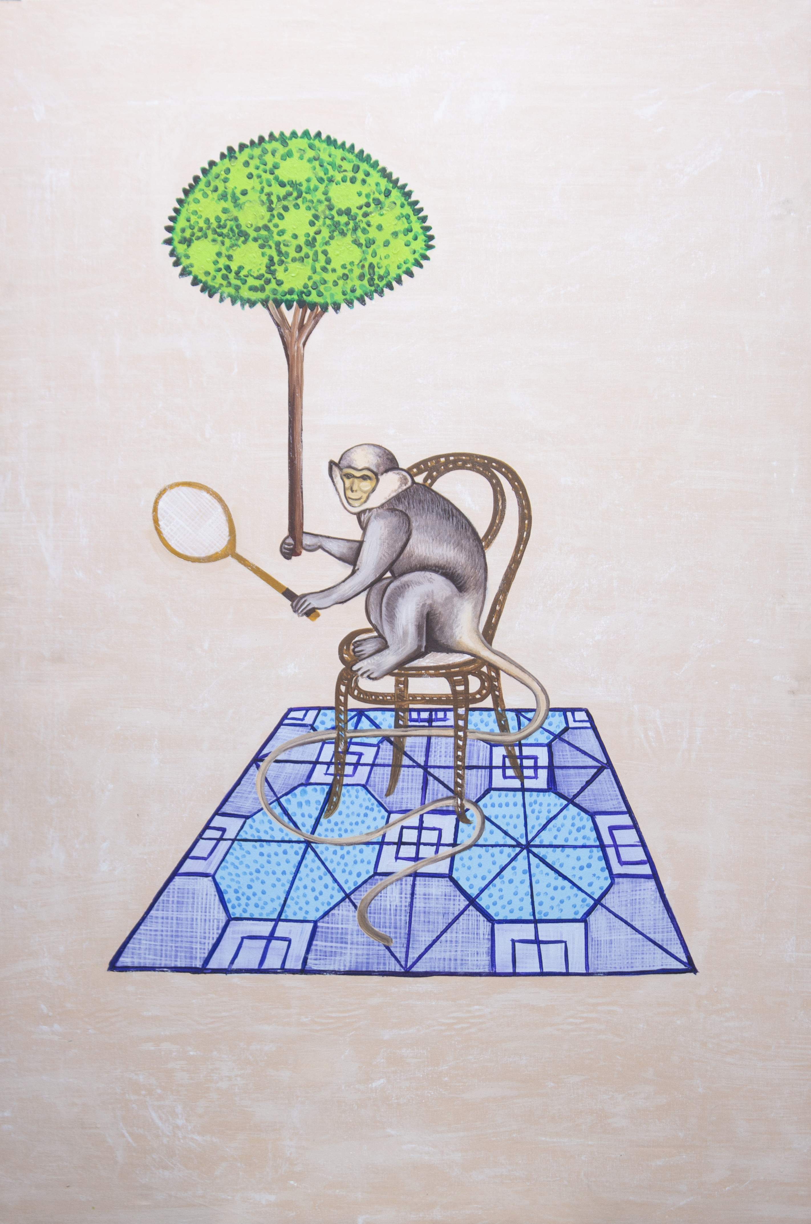This playful artwork blends surrealism with a touch of humor, portraying a monkey seated on a vintage chair, holding a racket beneath a tree. The geometric patterns beneath contrast with the organic elements, creating a harmonious yet whimsical scene. It invites viewers to explore themes of balance, nature, and the unexpected.