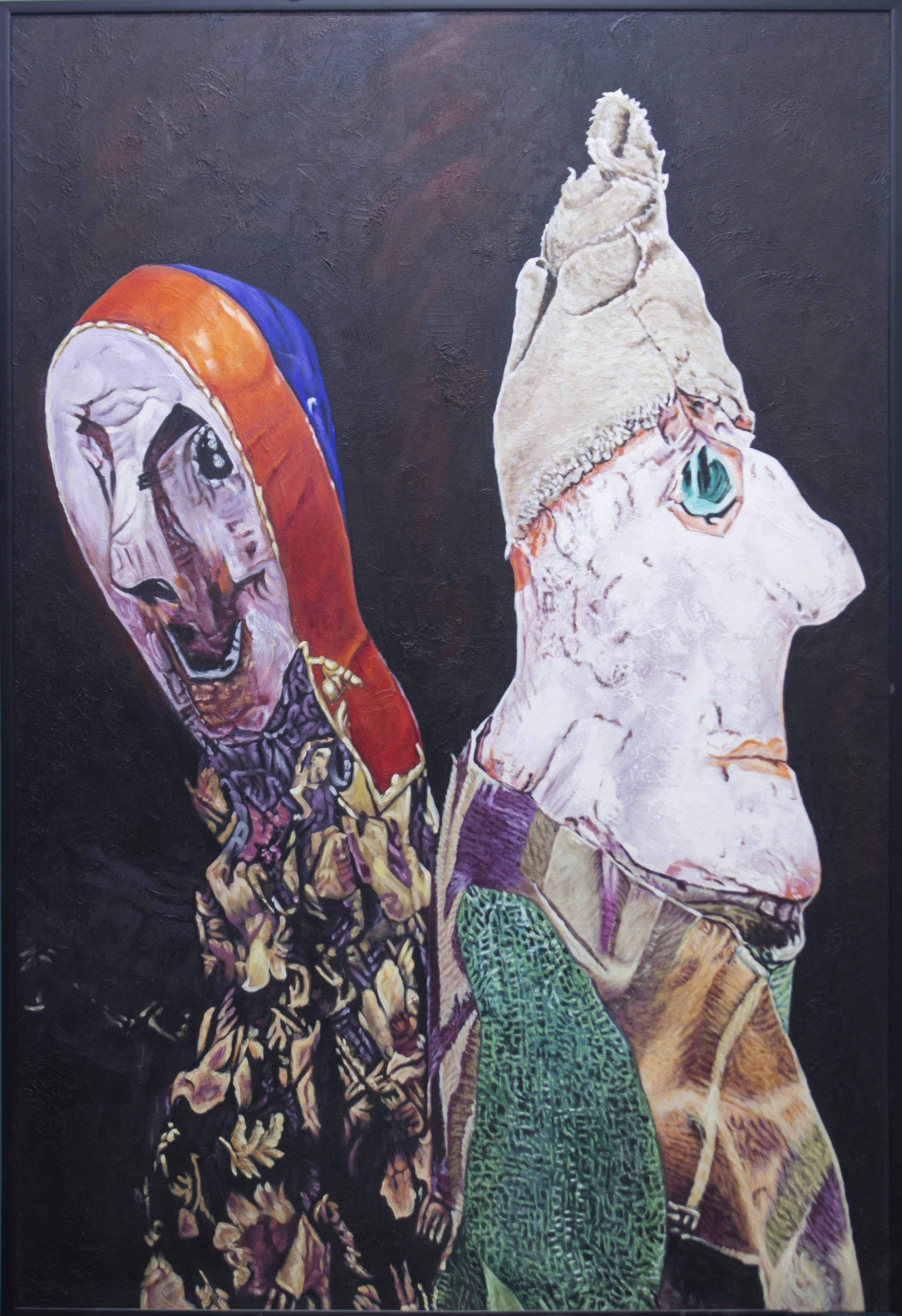 This intriguing piece captures the surreal interplay between form and identity, emphasizing expressive textures and vivid contrasts. The two figures, clothed in patchwork attire, evoke a sense of mystery, inviting viewers to contemplate the narratives behind their distorted expressions. The rough, almost tactile surface, combined with bold colors, creates a powerful, enigmatic presence.